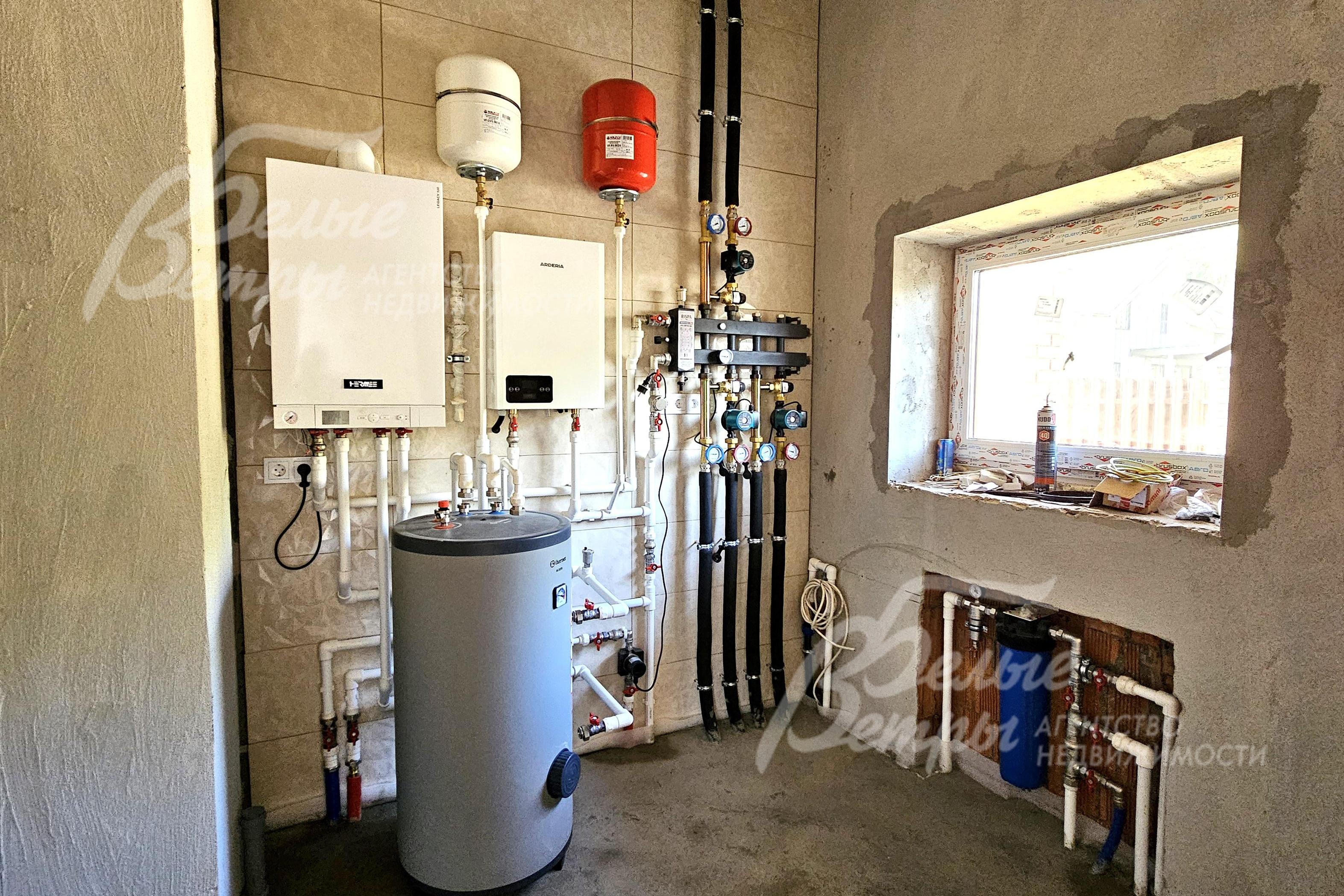 Инженерное обеспечение: заведены вода, электричество и газ, электрика и мокрые коммуникации (мокрые зоны) разведены до точек. Отопление – через газовый настенный котёл Viessmann Vitopend 100 (также есть резервный электрический котёл): обвязка из металлопластика. Горячее водоснабжение – через накопительный бойлер. Есть система грубой очистки воды.
