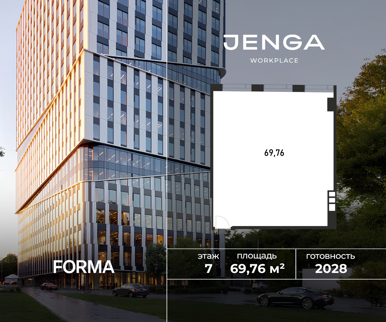 JENGA - новый workplace в районе Покровское-Стрешнево в 1 минуте пешком от станции МЦД «Щукинская». Пространство станет частью развивающейся деловой локации с развитой инфраструктурой и природой в непосредственной близости. Выгода до 25% в декабре. Цена указана при 100% оплате. • Общая площадь - 59 969 м²• Наземная площадь - 54 482 м²• Офисная площадь - 42 588 м²• Количество этажей - 23• Паркинг - 135 мест• Ввод в эксплуатацию - 3 квартал 2028 г.• До станции МЦД-2 «Щукинская» - 1 минута пешком• До станции метро «Щукинская» - 5 минут пешком Преимущества:• 14 минут до Белой площади, м. «Белорусская»• Экологически чистый район с множеством лесопарковых зон• Лобби с lounge-зoнoй, эспрессо-баром, meeting-зoнoй, банкоматами и постаматами• Панорамные виды на парк Покровское-Стрешнево и город