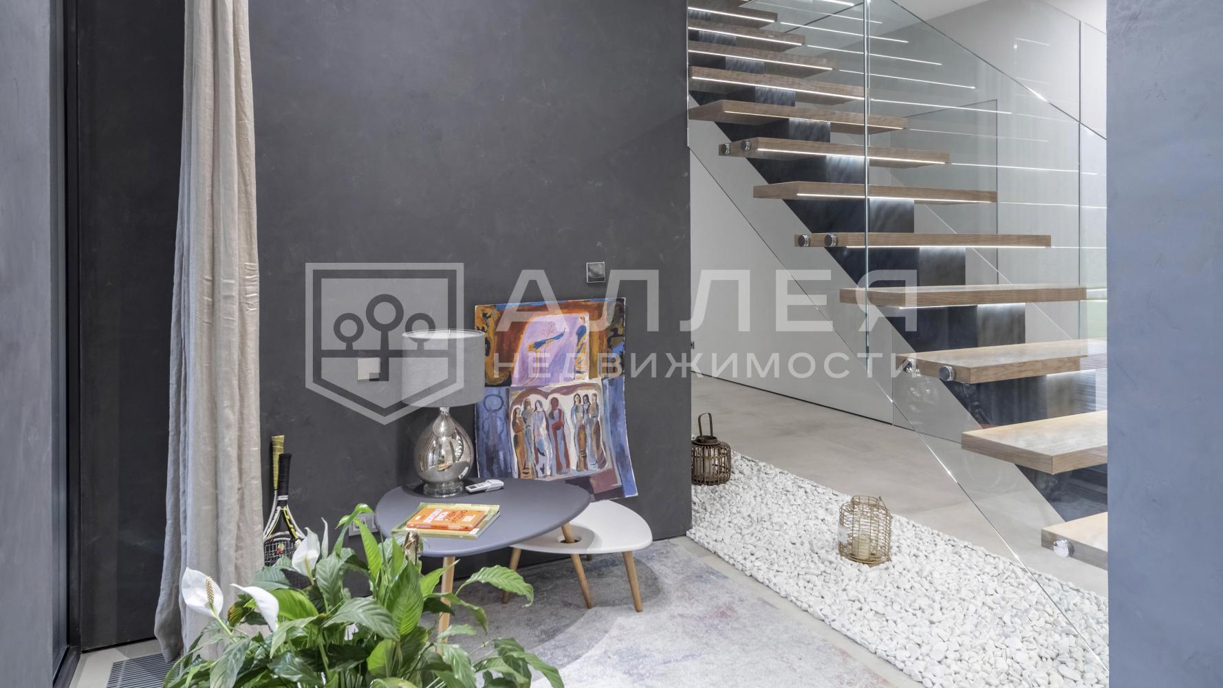 Стильный дом с эксплуатируемой кровлей на прилесном участке. Выполнен качественный, современный ремонт. Полностью меблирован и готов к проживанию. Высокие потолки и дверные проемы. Панорамное остекление остекления. Есть спальня и кабинет на первом этаже. Просторная терраса на эксплуатируемой кровле с шикарным видом на лес. Гараж на два авто.