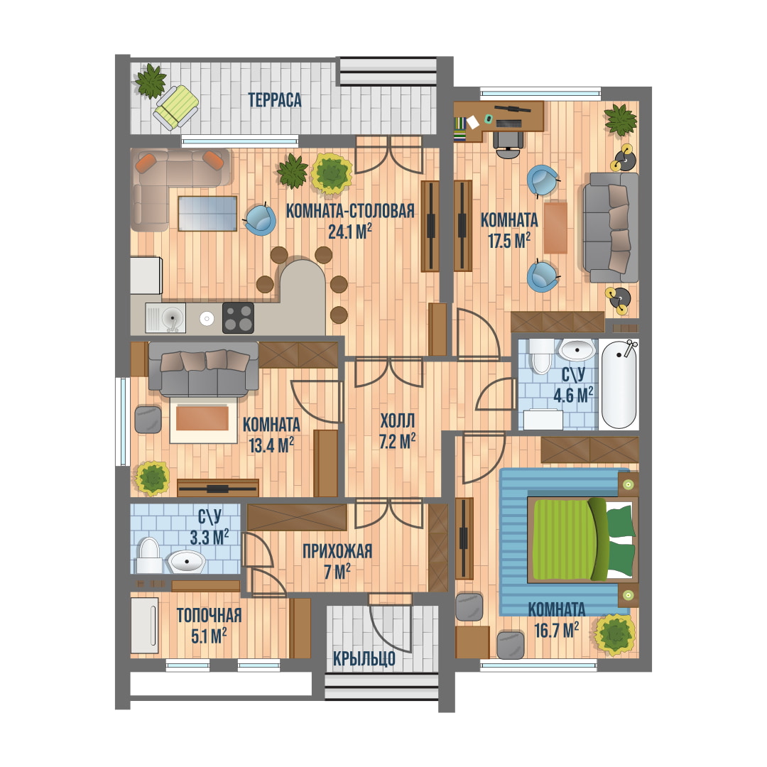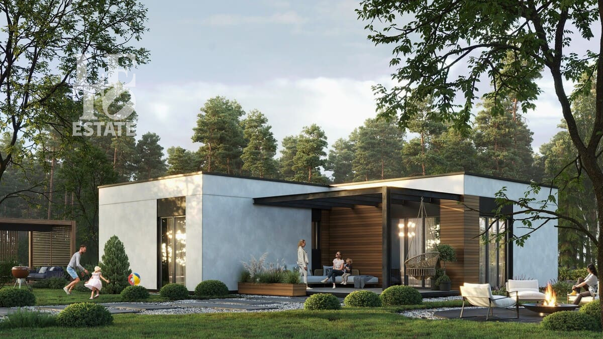 Каждый дом имеет продуманную планировку, а именно: большую кухню-студию с высокими потолками (5 метров), мастер-спальню с гардеробом и санузлом, 2 отдельные спальни,санузел, техническое помещение. Дома построены профессиональным застройщиком из качественных материалов. В каждом помещении — панорамные окна, из которых открывается вид на лес и природу. Размер окон придает нереальный простор и освещенность.