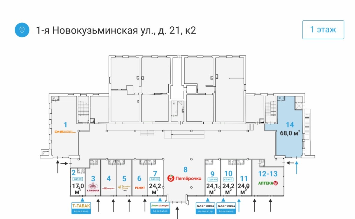 Номер лота на нашем сайте: 37867. Продается торговое помещение свободного назначения, общей площадью 68 кв.м., в непосредственной близости от станции метро "Рязанский проспект" - менее 1 минуты пешком. Интенсивный пешеходный поток. На плане помещение номер 14.