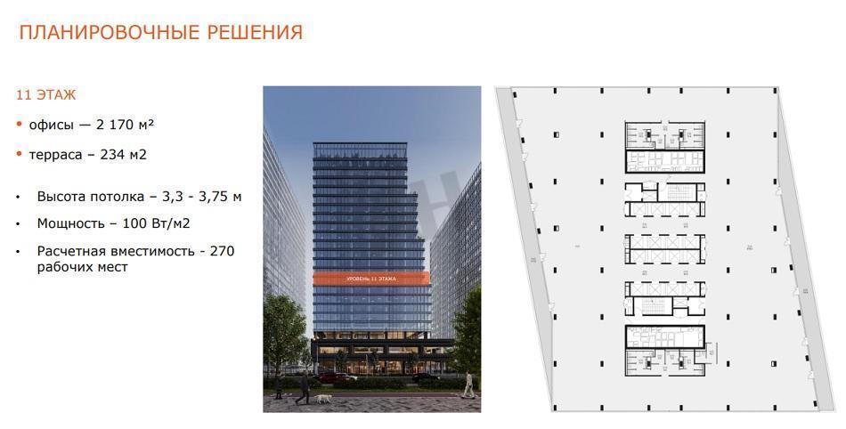 Общая площадь офисных зон составляет 14 956,7 м², дополнительно предусмотрены террасы площадью 1 027,4 м². Высота потолков варьируется от 3,3 до 3,75 метра. Для комфортной работы выделена электрическая мощность 100 Вт/м². Система кондиционирования и вентиляции обеспечивает воздухообмен 60 м³/час по схеме чиллер-фанкойл.
