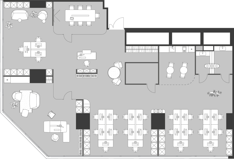 . На первом этаже здания — лобби с комфортной зоной ожидания, кофе-поинтами и банкоматами, ресторан и торговая зона. Со второго этажа располагаются офисные помещения, формат которых предусматривает «нарезку» по желанию арендатора. Эргономичные openspace-планировки дают возможность организовать на каждом этаже функциональные рабочие зоны, переговорные комнаты, кабинеты руководителей, конференц-зал, бизнес-гостиные и зоны отдыха.