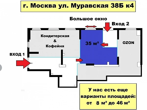 Предлагается помещение в аренду по адресу Муравская 38бк4. Общая свободная площадь 54 м2. Возможна аренда отдельных площадей 46 м2, 35 м2, и 8 м2.