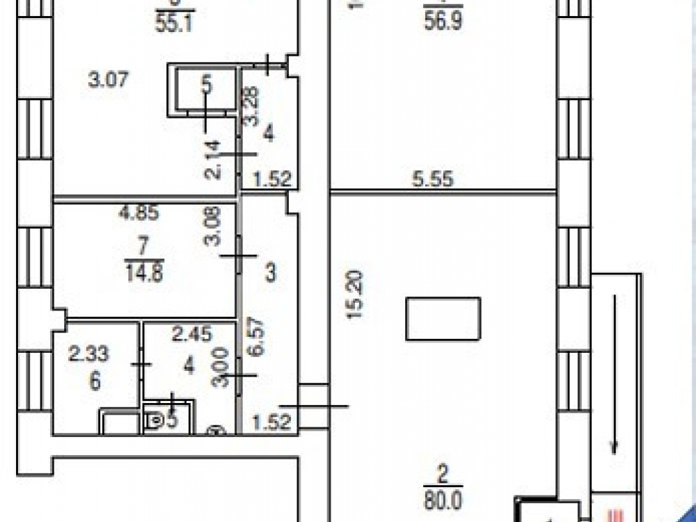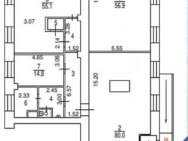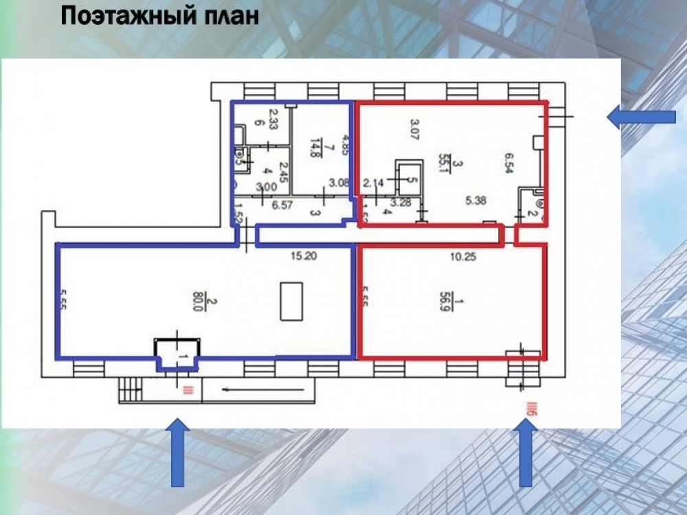 . Два отдельных входа с улицы и один с торца здания. Открытая планировка.
