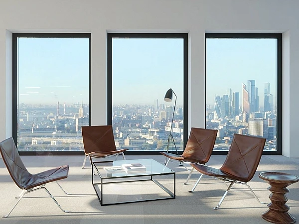 . Панорамное остекление насыщает пространство естественным светом, а стильные ресепнш
