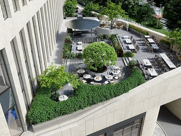 . Современные многофункциональные террасы интегрированы в архитектуру бизнес-центра,