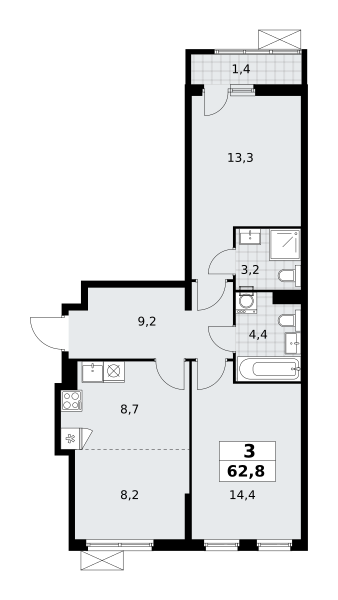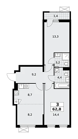 Продаётся 3-комнатная квартира, площадью 62,8 кв. м на 7-м этаже дома стандарт-класса в ЖК "Дзен-кварталы". Квартира с функциональной планировкой: большие окна, высота потолка 2,8 м, балкон, мастер-спальня.