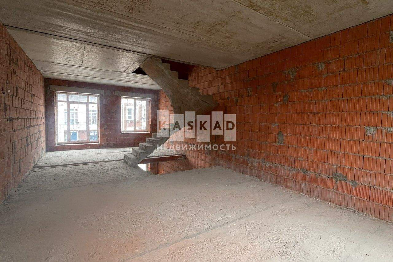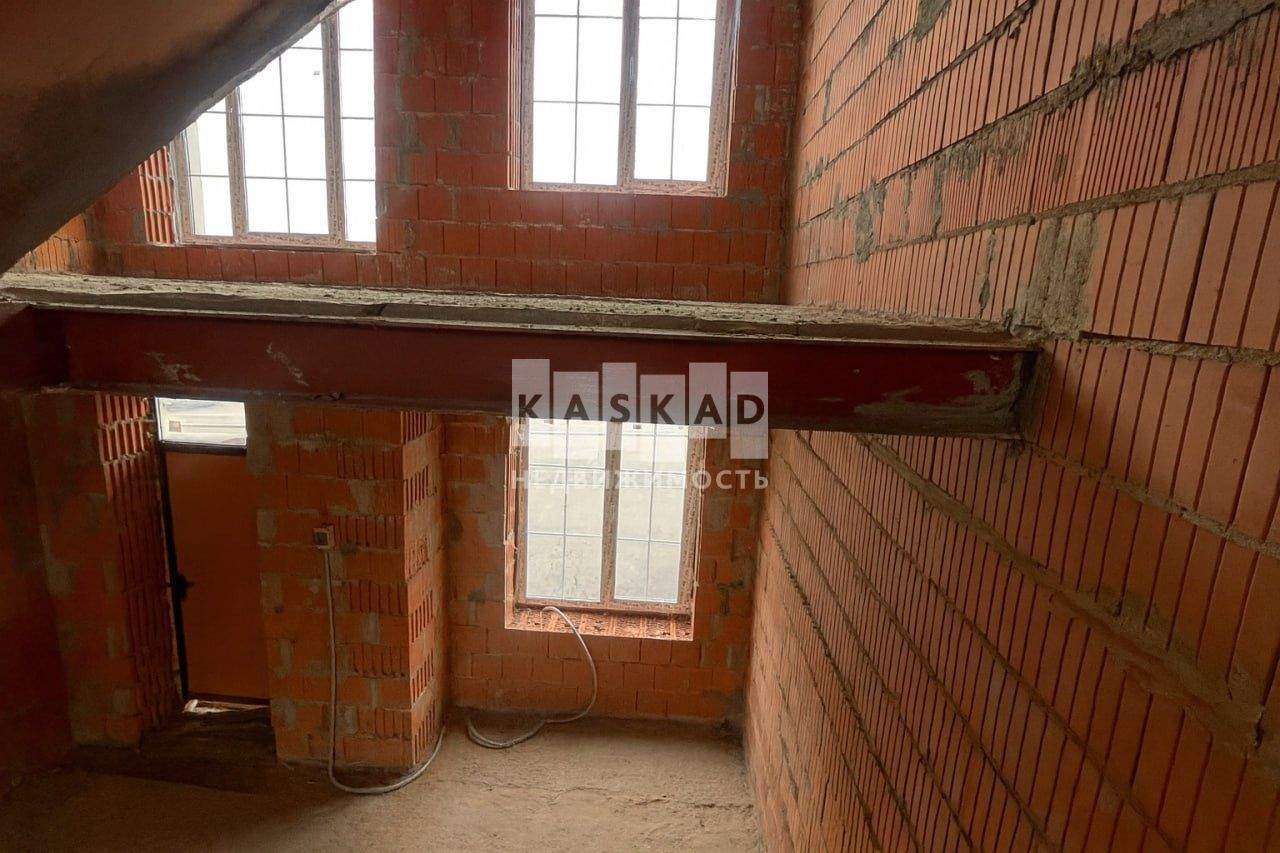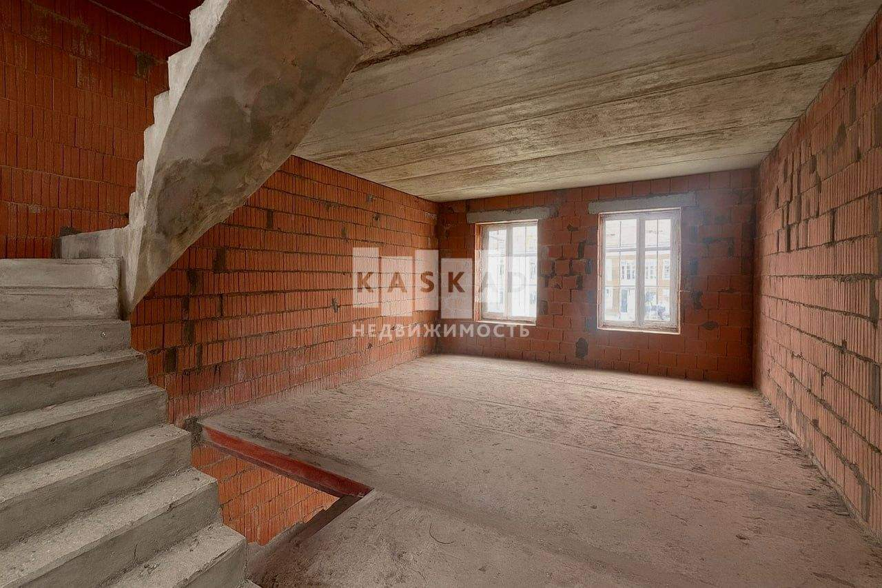 Таунхаус построен из кирпича, без отделки, лестница монолит, панорамное остекление.