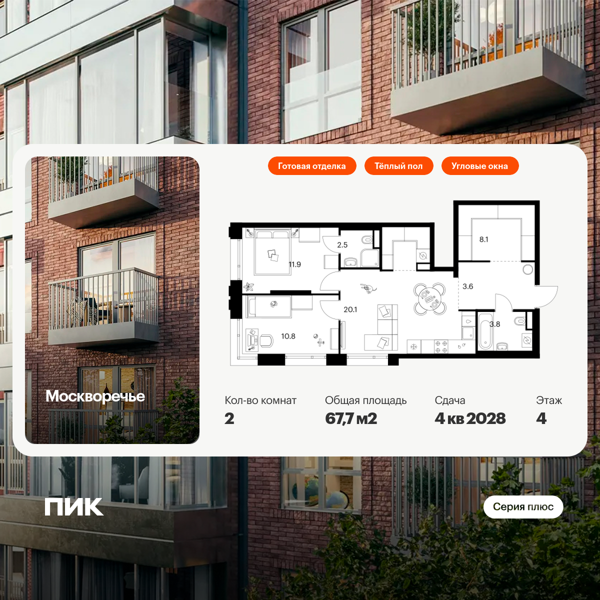 Отделка дизайнерская. Есть варианты квартир с предчистовой отделкой white box и без отделки в других корпусах ЖК.