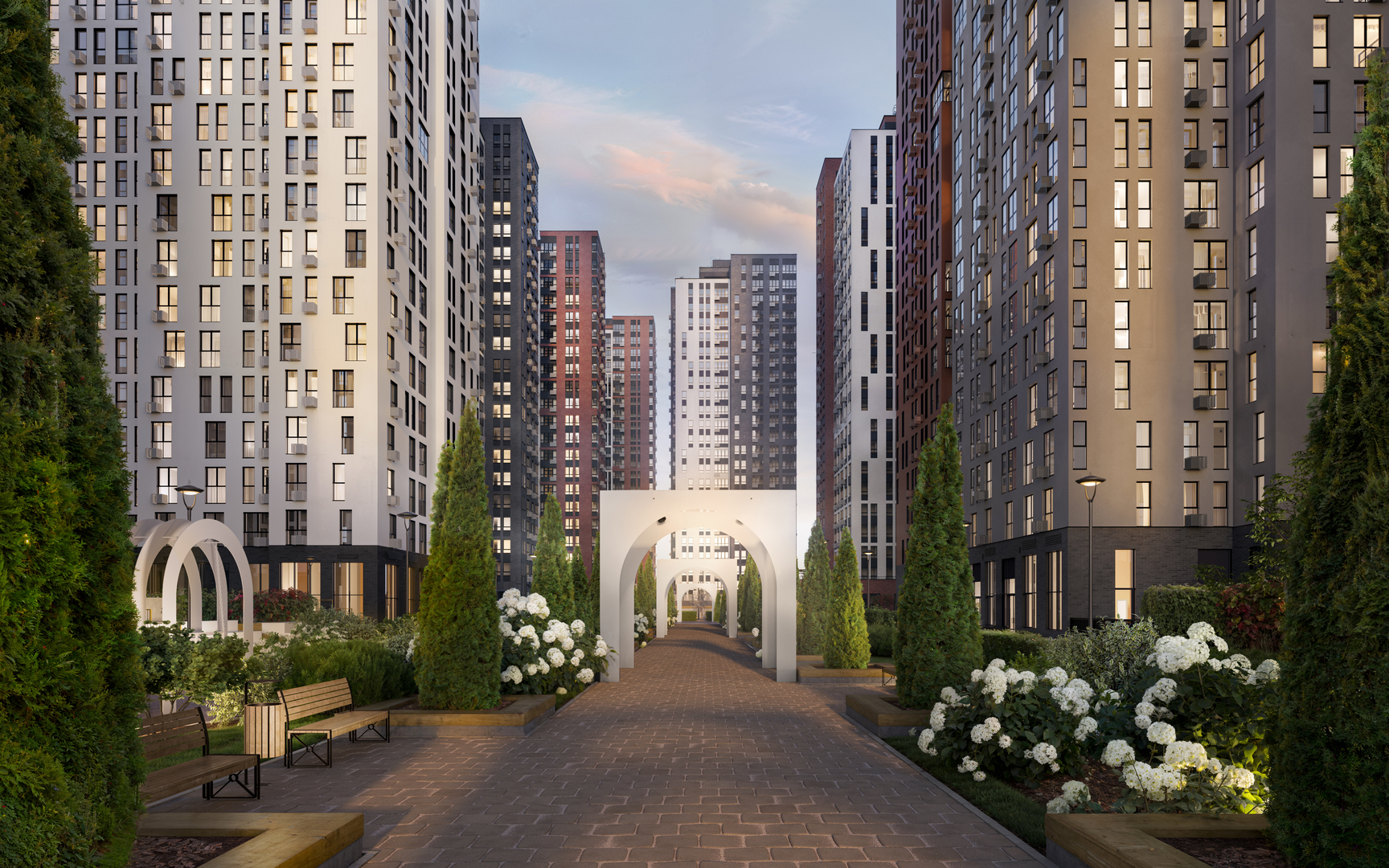 В районе будет реализовано уникальное благоустройство в стилистике средиземноморского сада (концепция архитектурного бюро MAParchitects): собственный парк; фруктовые, декоративные и вечнозелёные деревья, вертикальное озеленение, живые изгороди, кустарники и цветники; амфитеатр; двор-патио с геопластикой; детская площадка с горками и скалодромом. На первых этажах жилых домов откроются магазины, кафе с летними террасами, фитнес-залы, детские развивающие центры, салоны красоты и другие бытовые сервисы.