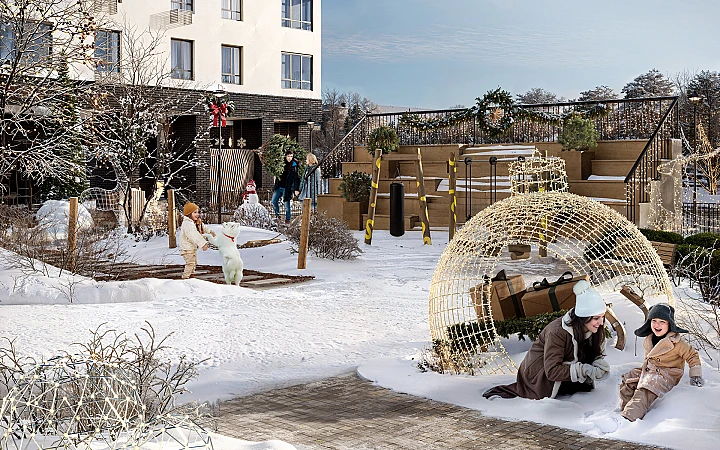 В районе будет реализовано уникальное благоустройство в стилистике средиземноморского сада (концепция архитектурного бюро MAParchitects): собственный парк; фруктовые, декоративные и вечнозелёные деревья, вертикальное озеленение, живые изгороди, кустарники и цветники; амфитеатр; двор-патио с геопластикой; детская площадка с горками и скалодромом. На первых этажах жилых домов откроются магазины, кафе с летними террасами, фитнес-залы, детские развивающие центры, салоны красоты и другие бытовые сервисы.