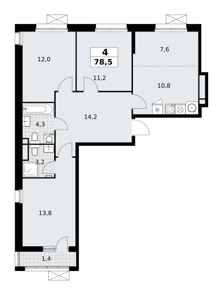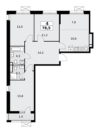 Продаётся 4-комнатная квартира, площадью 78,5 кв. м на 9-м этаже дома комфорт-класса в ЖК "Родные кварталы". Квартира с функциональной планировкой: большие окна, высота потолка 2,95 м, гардероб, мастер-спальня.