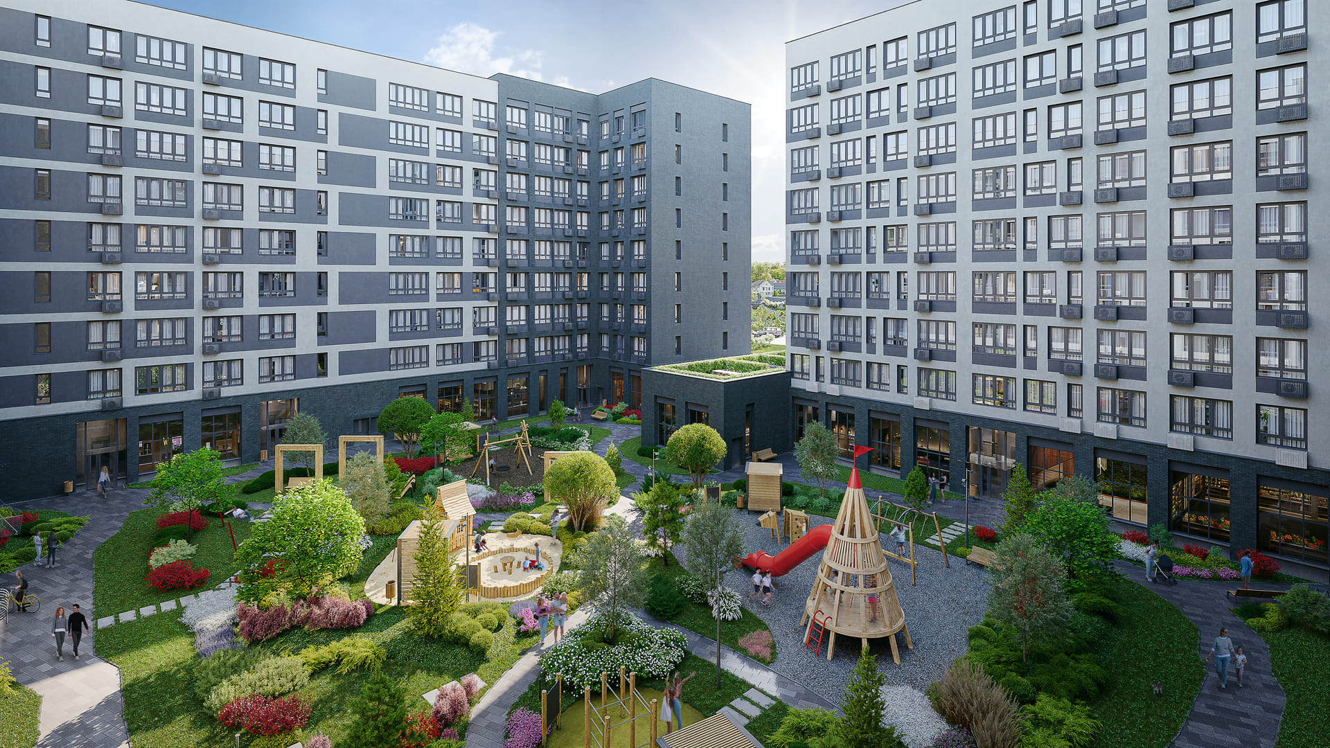 Всего в жилом комплексе будет оборудовано 6 га территории для спокойного отдыха и около 9 га — для активного.