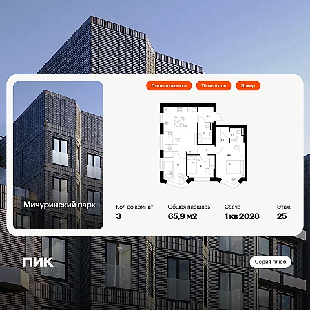 Продается 2-к. квартира номер 840 общей площадью 62 кв.м. на 22-м этаже 24 этажного дома, Корпус 9. С отделкой White Box Max.