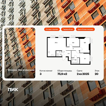 Продается 2-к. квартира номер 584 общей площадью 69.6 кв.м. на 3-м этаже 24 этажного дома, Корпус 9. С отделкой White Box Max.