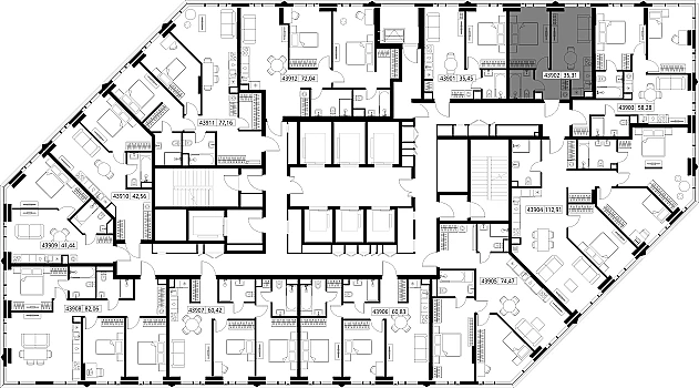 Особенностью проекта стала возможность выбирать и адаптировать планировки квартир под свои нужды. Здесь можно выбрать квартиры с постирочными, гардеробной или спальней с ванной комнатой. А можно выбрать квартиру со сквозным санузлом или планировку семейной квартиры со спальнями в разных сторонах гостиной. Артикул - 993608