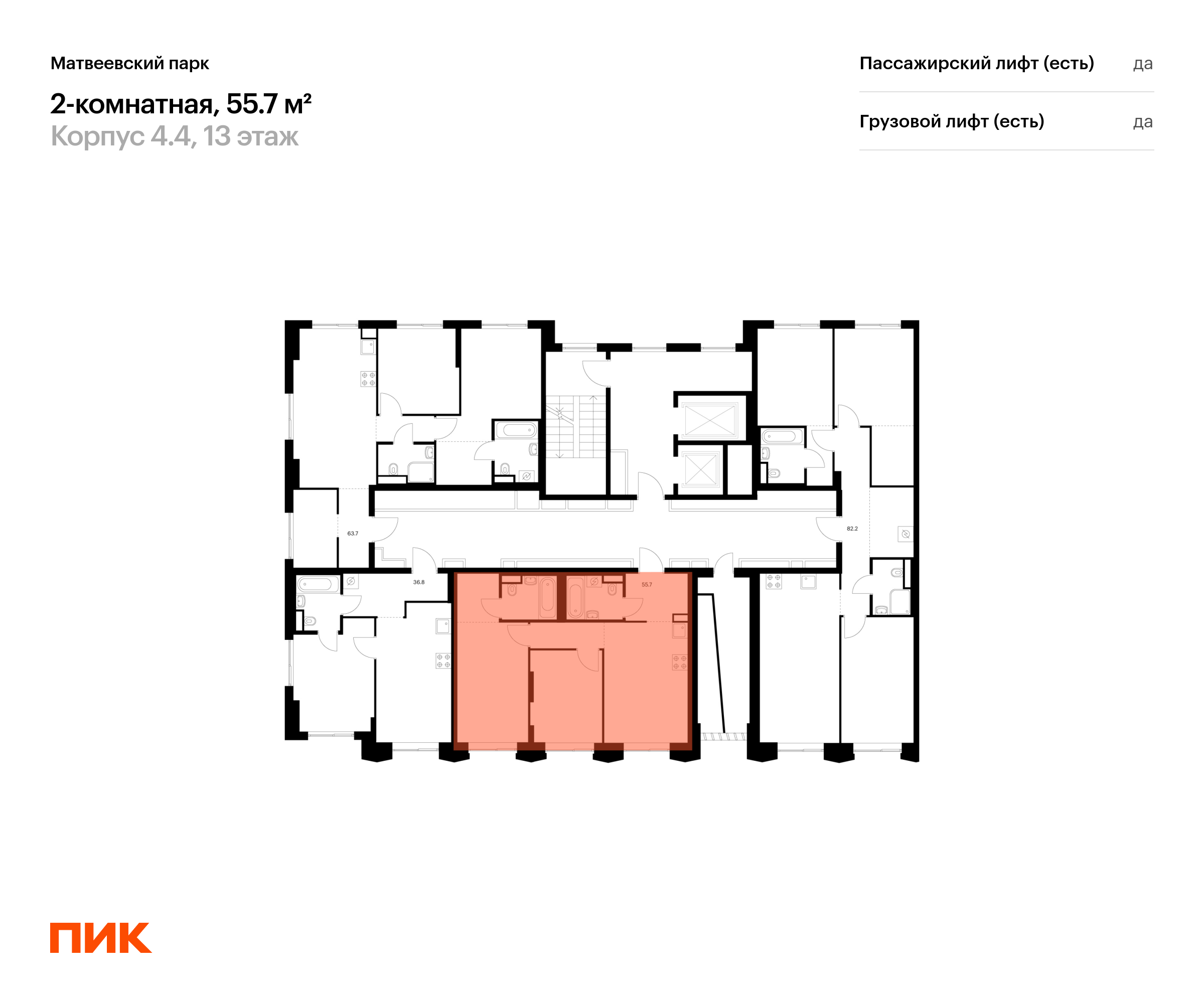 Продаётся 2-комн.квартира площадью 55.70 кв.м на 13 этаже 13 этажного дома (Корпус 4.4, секция 2) проекта ПИК Матвеевский парк. Светлый просторный подъезд на уровне земли, функциональная планировка, большие окна, с отделкой.