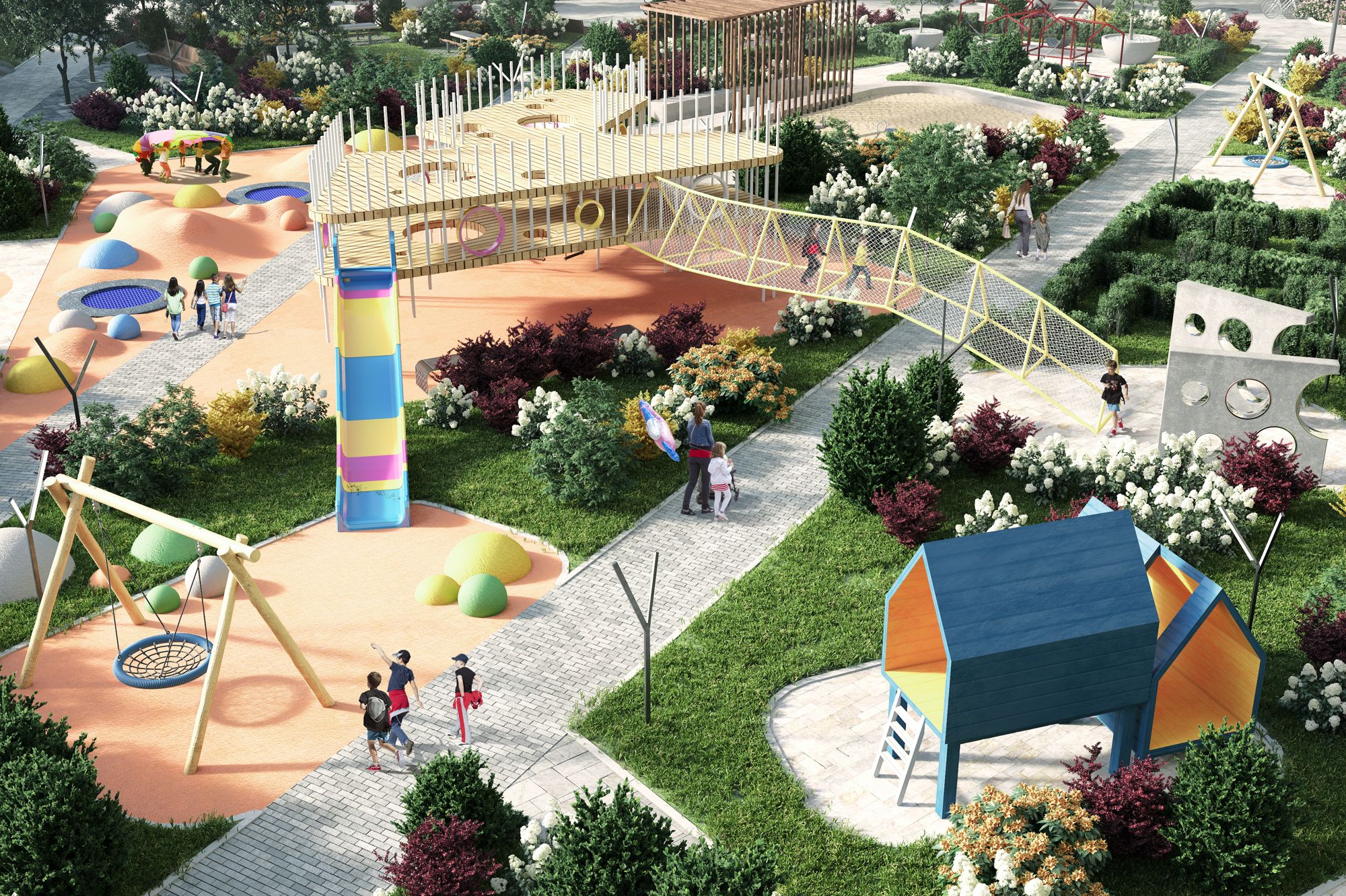 Свой приватный двор-сквер площадью 3 600 м2 с пространствами для всех возрастов: на территории располагаются игровые площадки, детский городок, песочница, воркаут-зоны, батуты, места для отдыха, лабиринты, настольный теннис и шахматные столы.