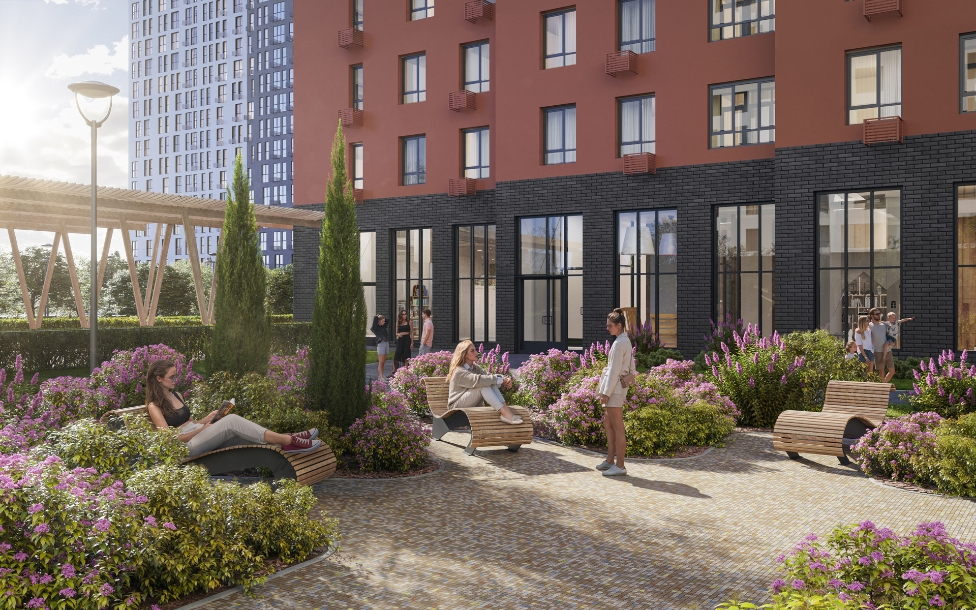 В районе будет реализовано уникальное благоустройство в стилистике средиземноморского сада (концепция архитектурного бюро MAParchitects): собственный парк; фруктовые, декоративные и вечнозелёные деревья, вертикальное озеленение, живые изгороди, кустарники и цветники; амфитеатр; двор-патио с геопластикой; детская площадка с горками и скалодромом. На первых этажах жилых домов откроются магазины, кафе с летними террасами, фитнес-залы, детские развивающие центры, салоны красоты и другие бытовые сервисы.