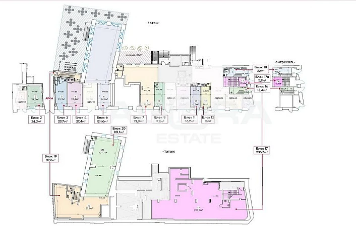 Площадь 16 кв.м (на плане - Блок 12), 1 этаж, отдельный вход с улицы. Планировка открытая, высокие потолки, состояние - с отделкой.