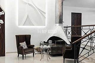 Первый этаж: просторный холл, большая столовая, функциональная кухня, гостиная с камином из натурального мрамора