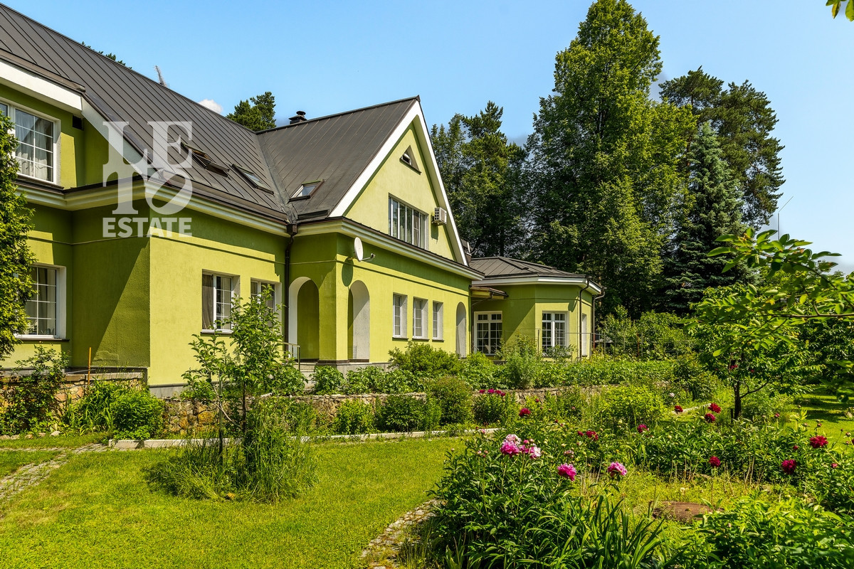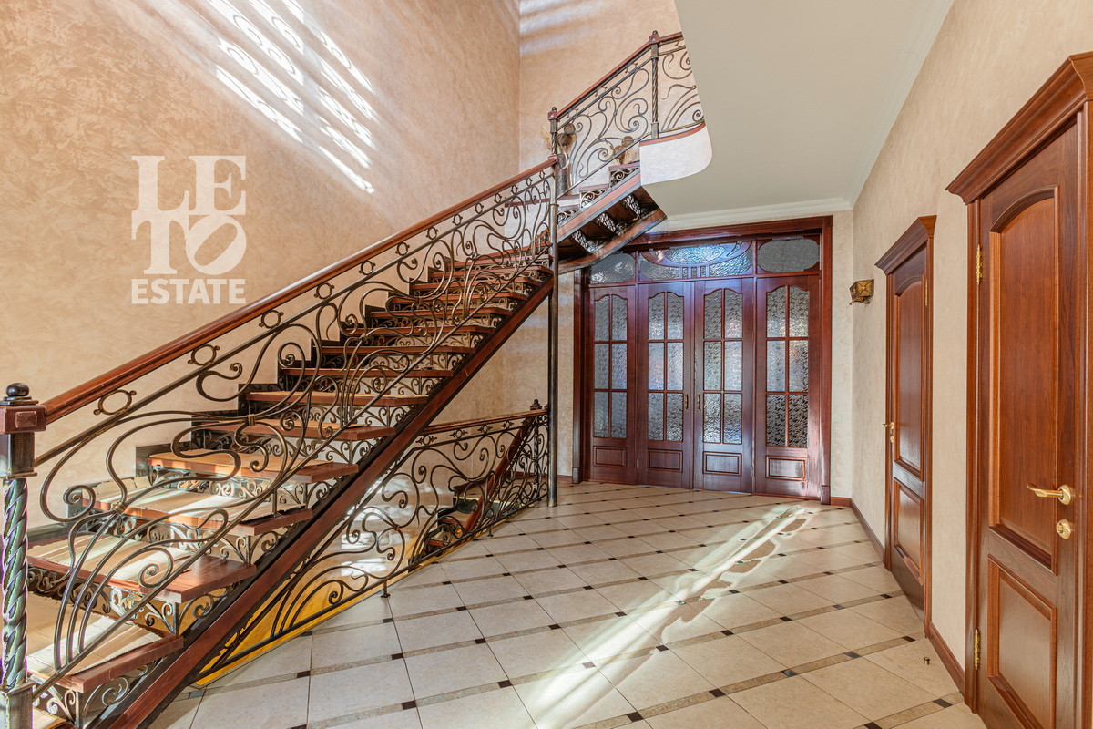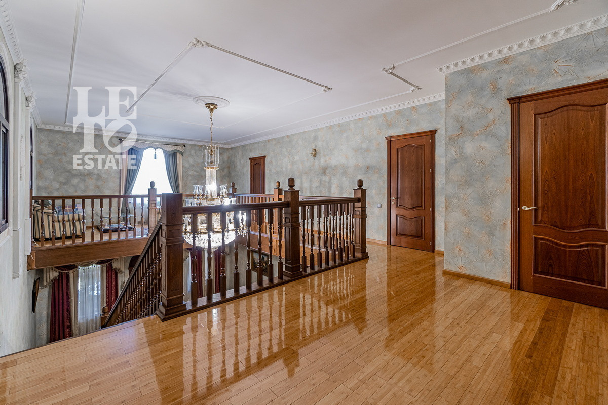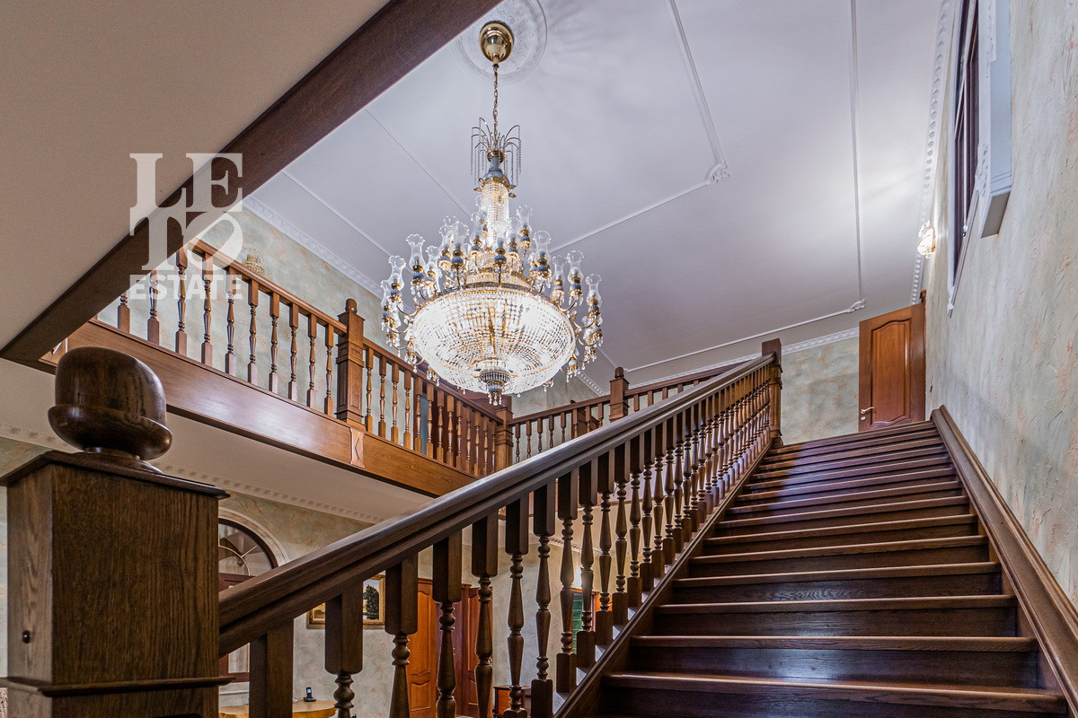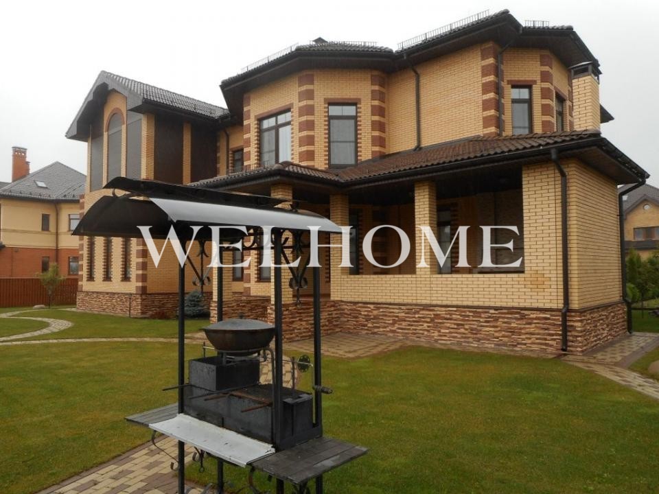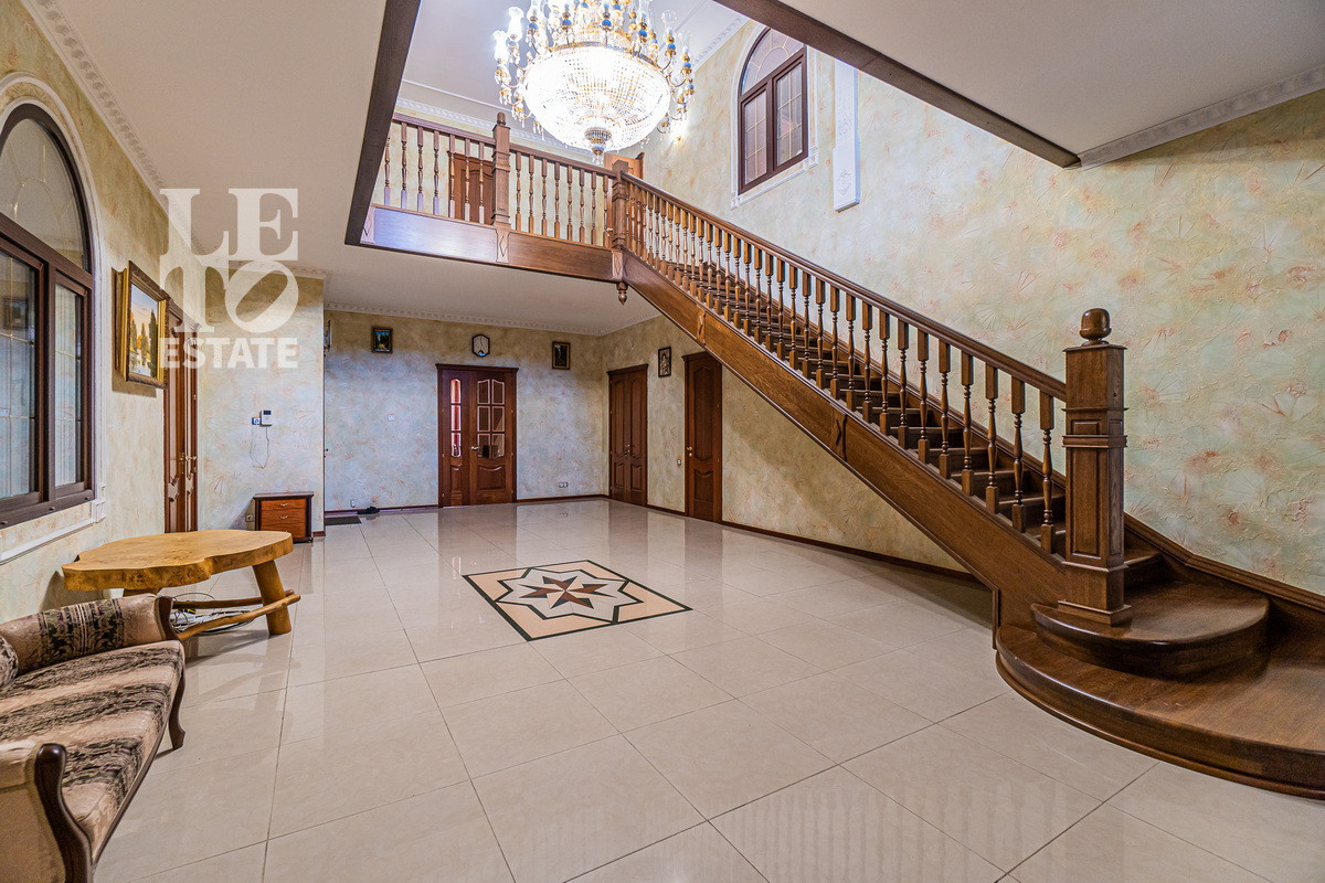 Дом 2013 года постройки, состоит из двух этажей, а также цокольного, полностью меблирован и готов к проживанию, ремонт выполнен из дорогих, высококачественных материалов. Центром притяжения в доме, является большой холл с массивной лестницей из кавказского дуба и вторым светом. Также дом располагает пятью спальнями, зимним садом с зоной барбекю и террасой, зоной СПА с бассейном и сауной, в мансарде расположен спортзал. Дом стоит на монолитно-ленточном фундаменте глубиной 2,4 м. В стоимость входит отдельно стоящее здание с гаражом на первом этаже и квартирой для персонала на втором этаже. Несколько уровней подготовки и очистки воды. Все коммуникации центральные, отопление газовым котлом, мощностью 60 кВт. На участке выполнен ландшафтный дизайн, дорожки вымощены тротуарной плиткой, высажены плодовые, а также хвойные деревья, дубы, кустарники, цветы, виноград. Украшает сад пруд с фонтаном и рыбками. Поселок под круглосуточной охраной. До Пироговского водохранилища 4 км.