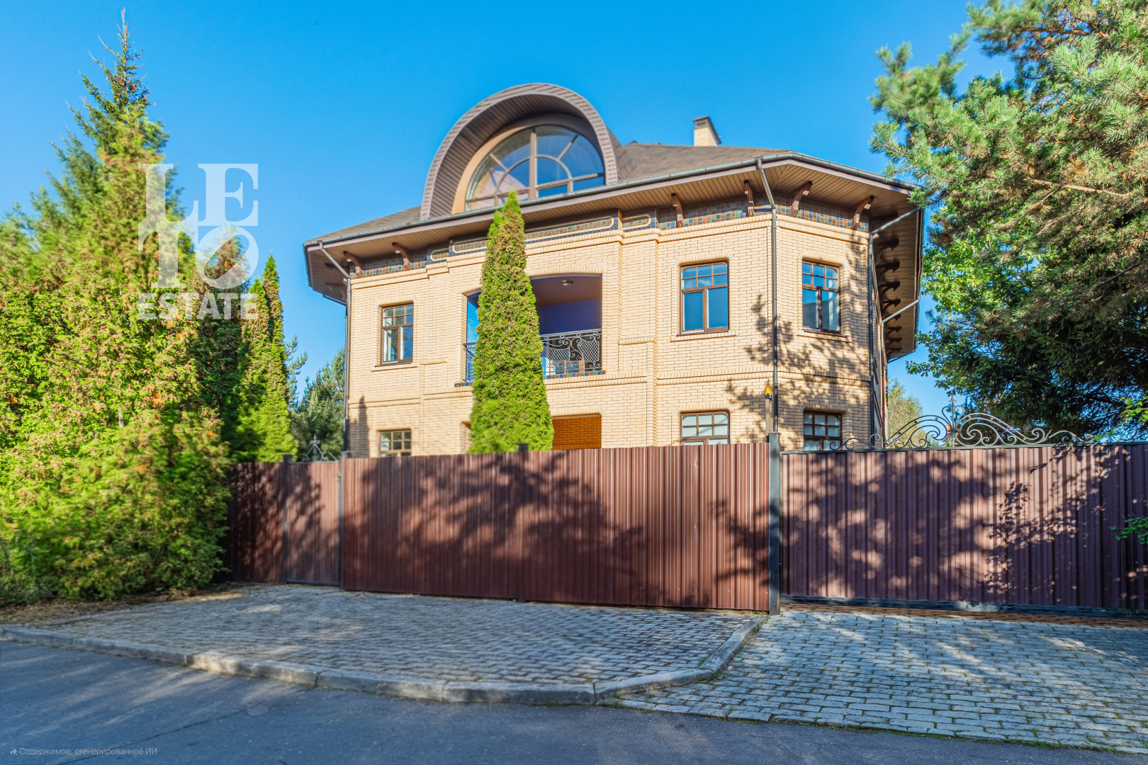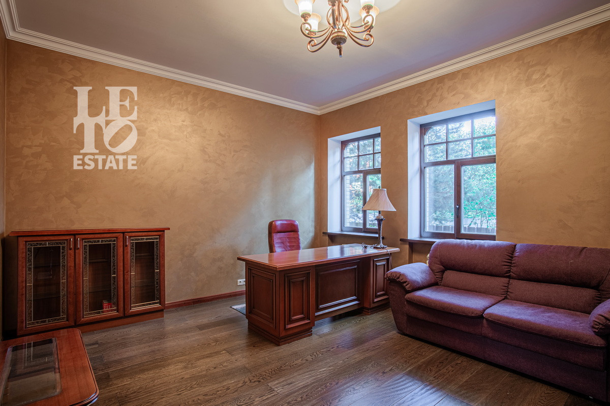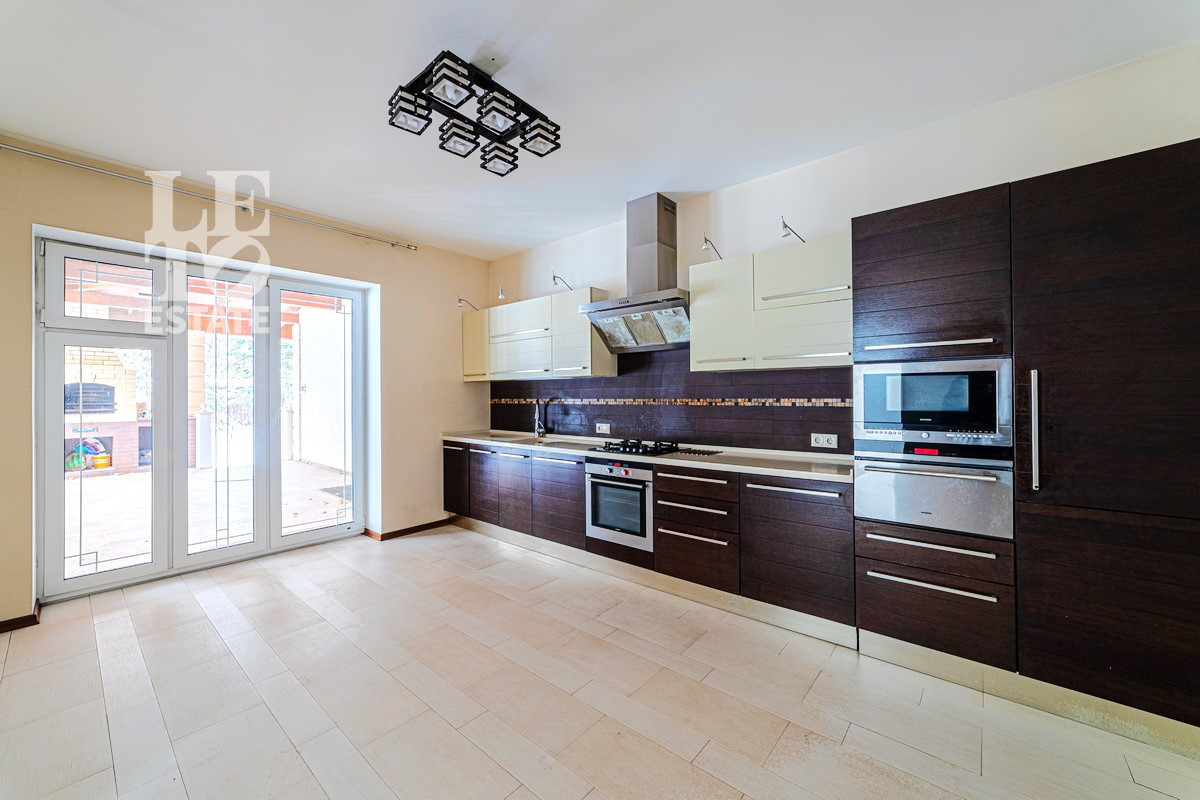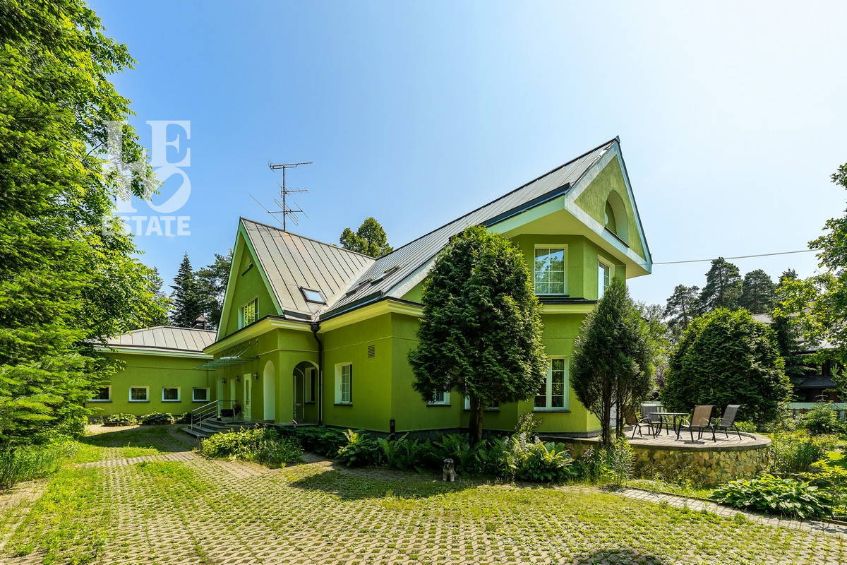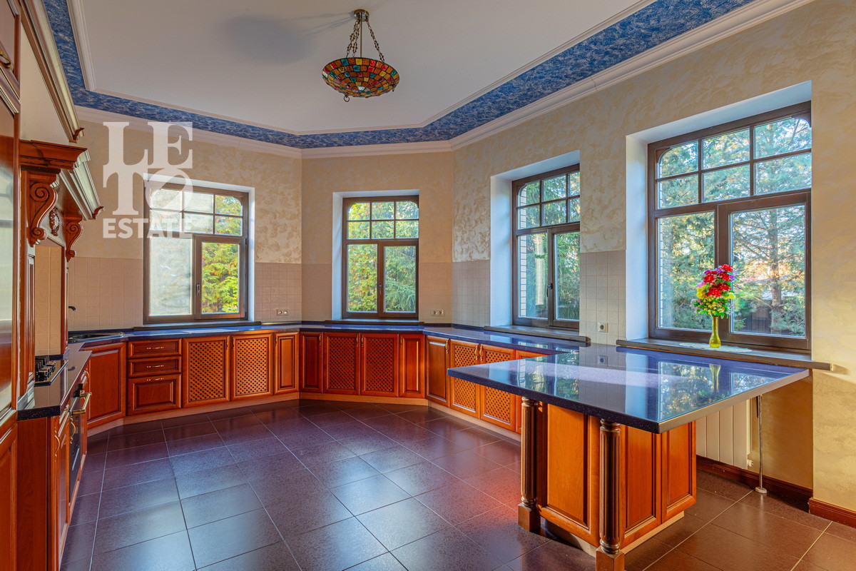 Дом 2013 года постройки, состоит из двух этажей, а также цокольного, полностью меблирован и готов к проживанию, ремонт выполнен из дорогих, высококачественных материалов. Центром притяжения в доме, является большой холл с массивной лестницей из кавказского дуба и вторым светом. Также дом располагает пятью спальнями, зимним садом с зоной барбекю и террасой, зоной СПА с бассейном и сауной, в мансарде расположен спортзал. Дом стоит на монолитно-ленточном фундаменте глубиной 2,4 м. В стоимость входит отдельно стоящее здание с гаражом на первом этаже и квартирой для персонала на втором этаже. Несколько уровней подготовки и очистки воды. Все коммуникации центральные, отопление газовым котлом, мощностью 60 кВт. На участке выполнен ландшафтный дизайн, дорожки вымощены тротуарной плиткой, высажены плодовые, а также хвойные деревья, дубы, кустарники, цветы, виноград. Украшает сад пруд с фонтаном и рыбками. Поселок под круглосуточной охраной. До Пироговского водохранилища 4 км.
