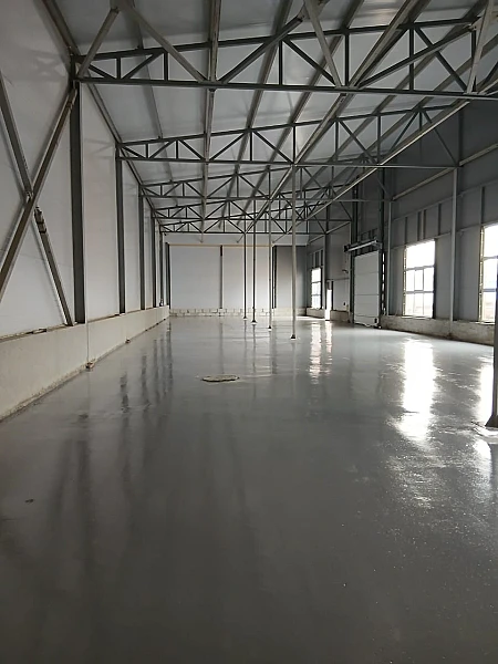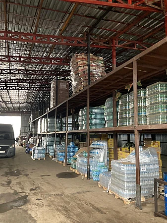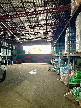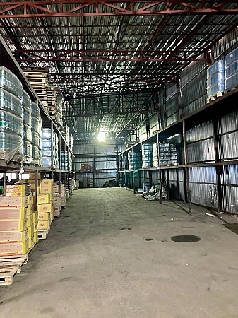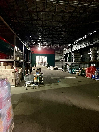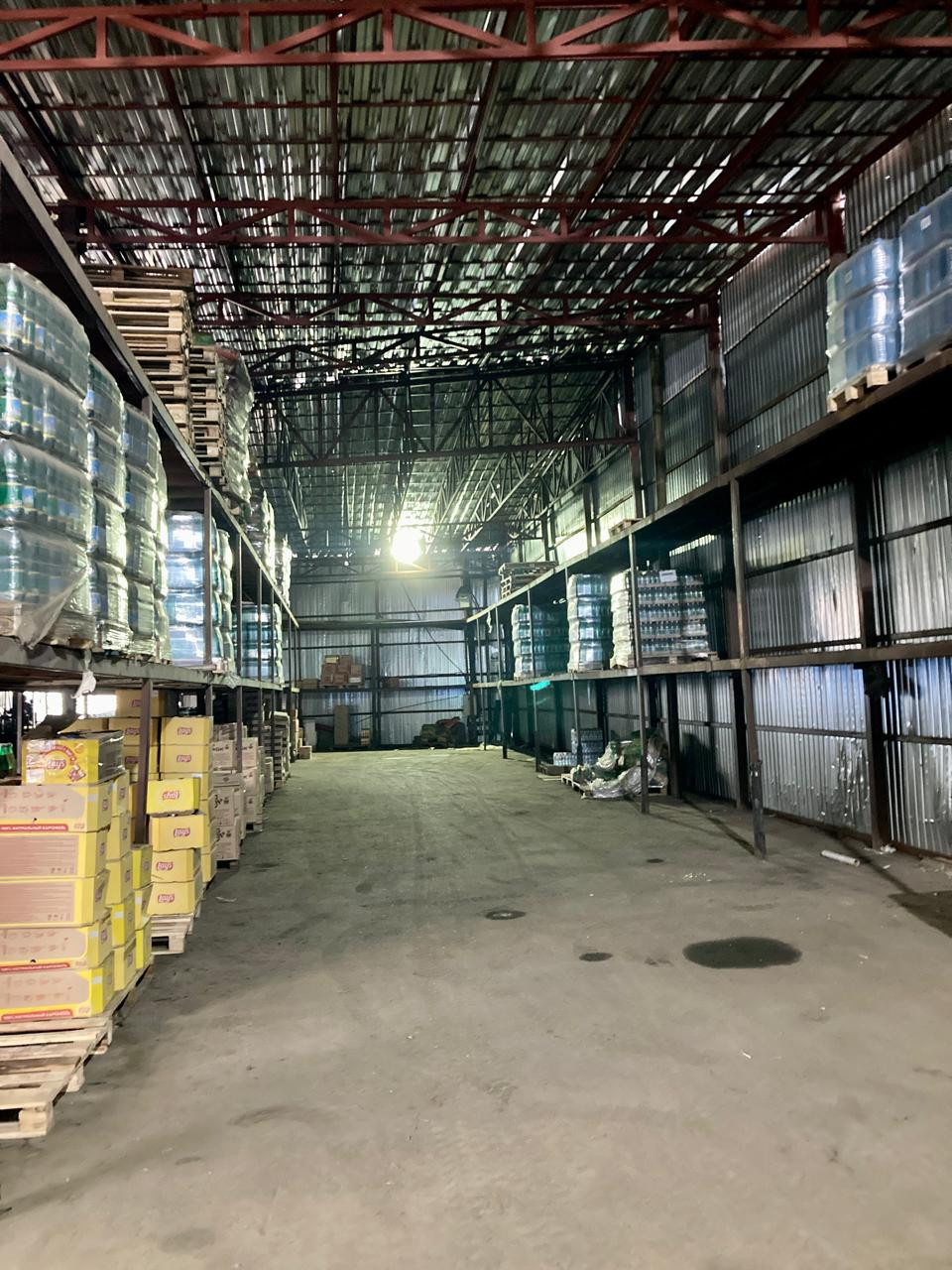 Есть двое ворот в ноль, место для погрузки-разгрузки фур. Установлены металлические стеллажи.