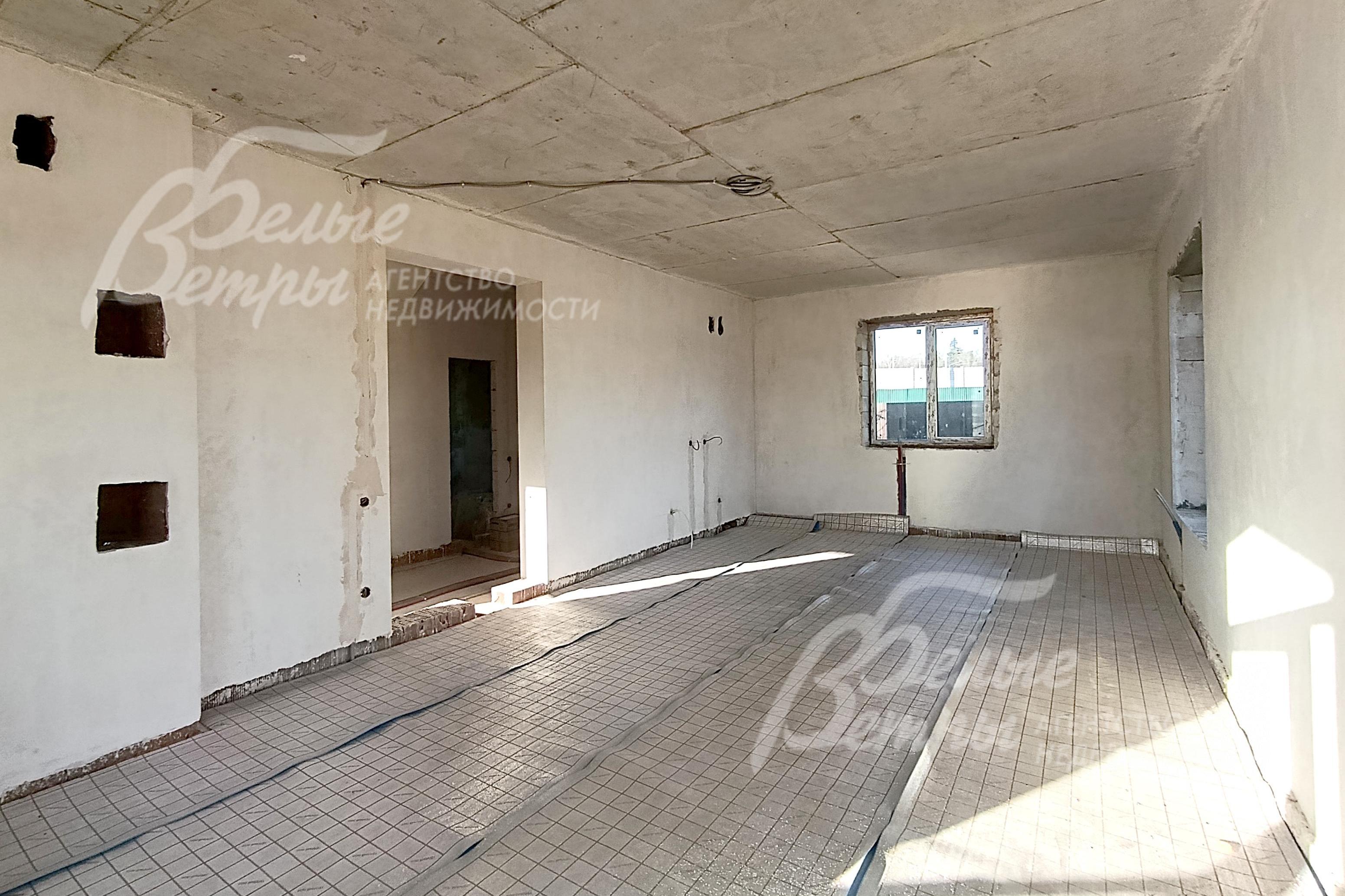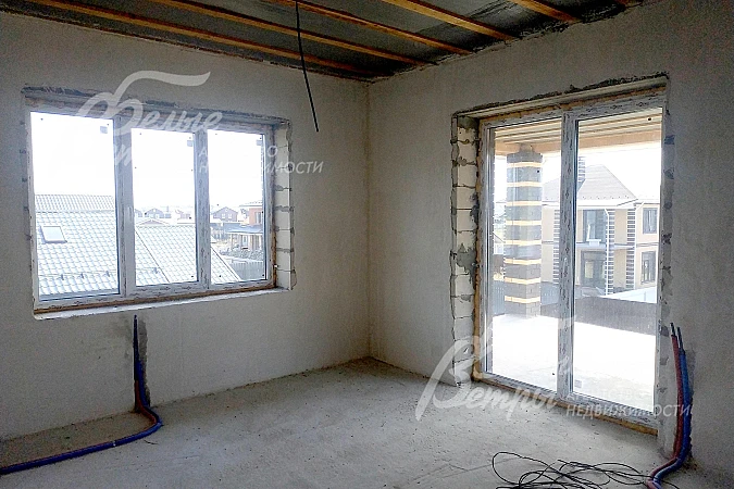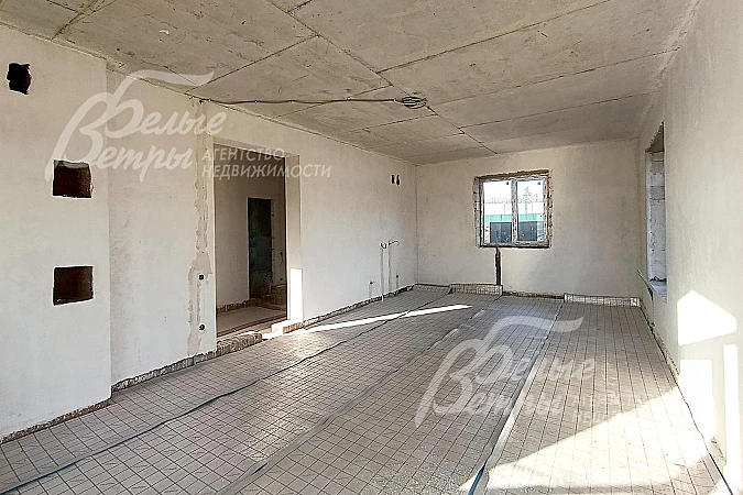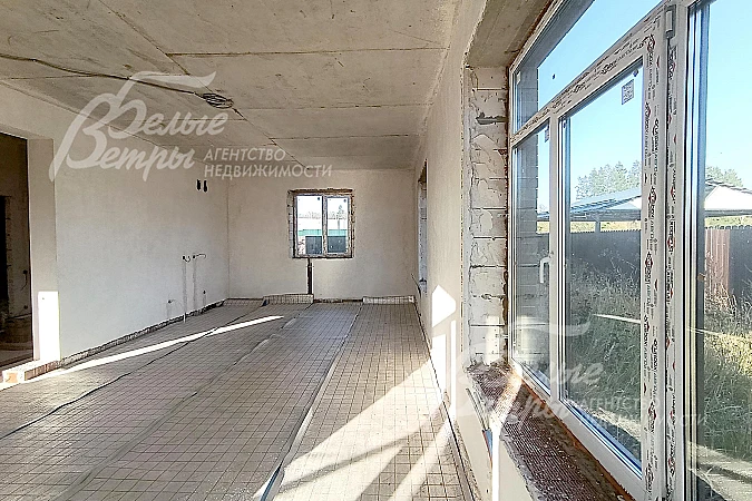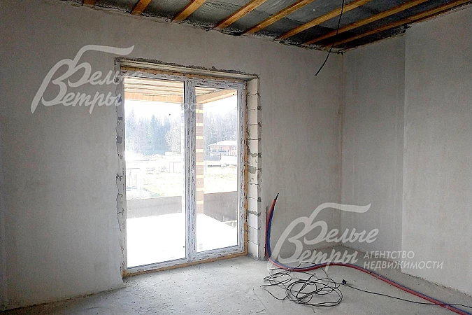 Внутренняя отделка: дом подготовлен к чистовой отделке. Стены оштукатурены, выполнена черновая стяжка пола (железобетонная монолитная), смонтирована бетонная лестница, установлены стеклопакеты.