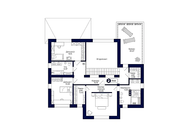 На втором этаже расположена уютная мастер-спальня с собственными ванной и гардеробной. Две дополнительные спальные комнаты с отдельными туалетом, ванной и общей гардеробной станут идеальным местом отдыха для детей или гостей.