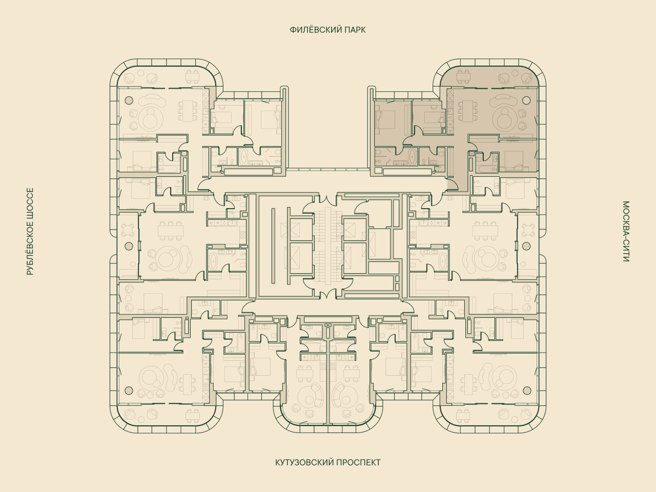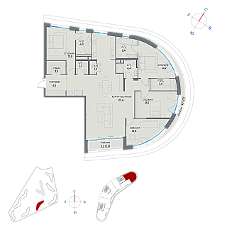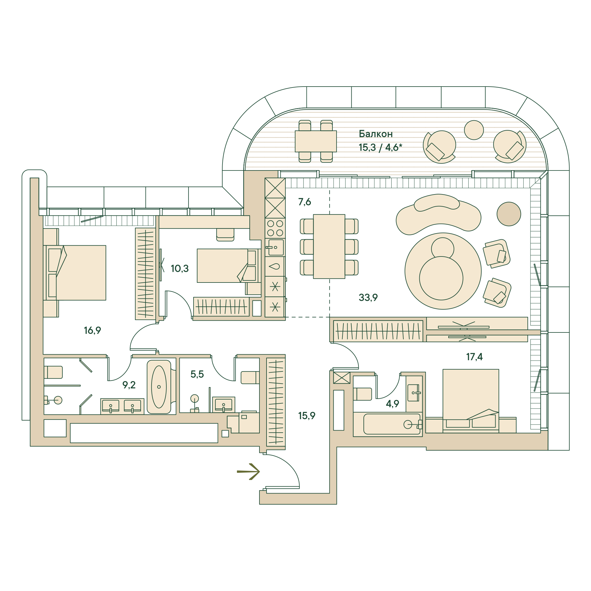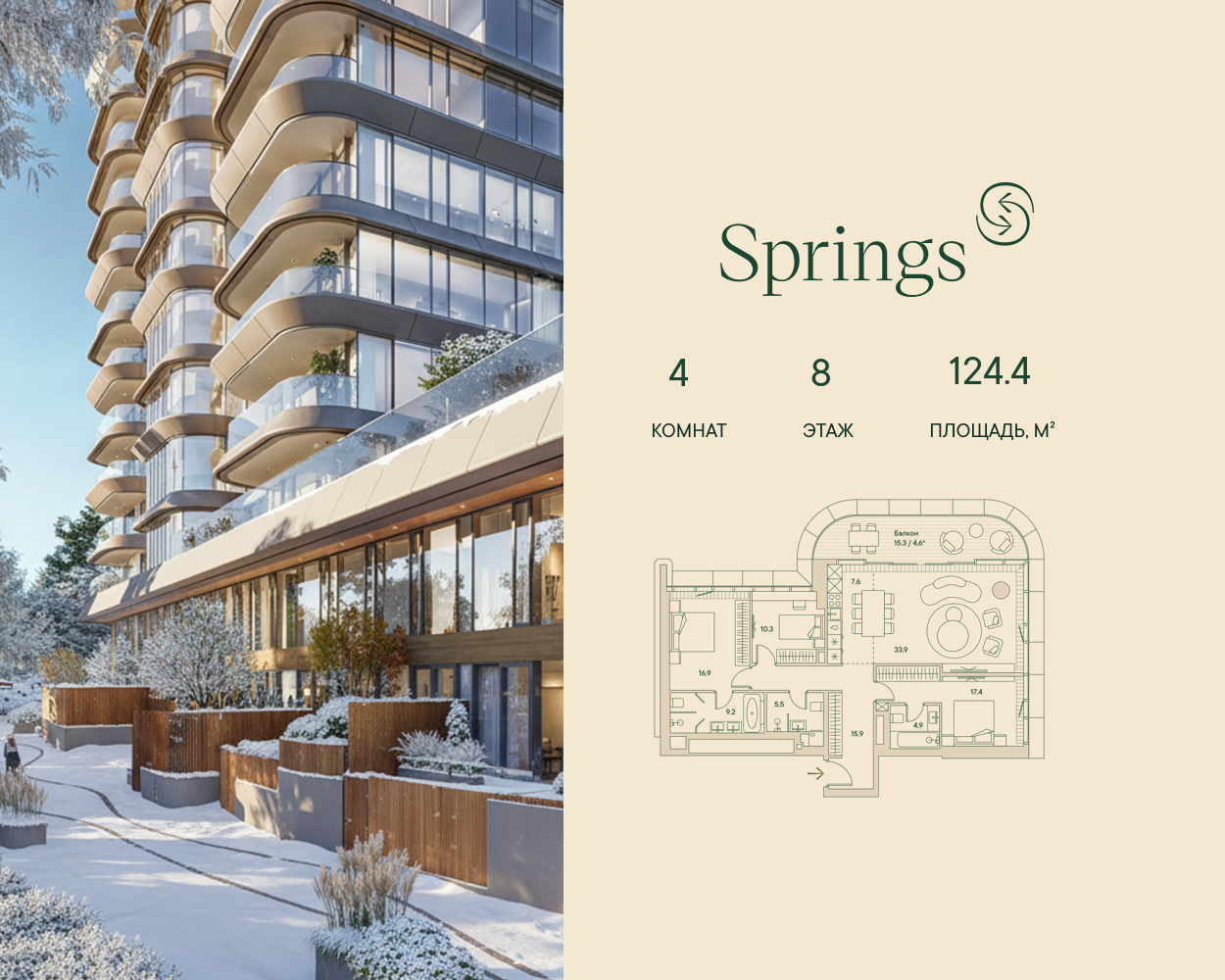 Четырёхкомнатная wellness-резиденция площадью 124.4 кв. м. на 8 этаже с видом на парк и центр в доме премиум-класса Springs.