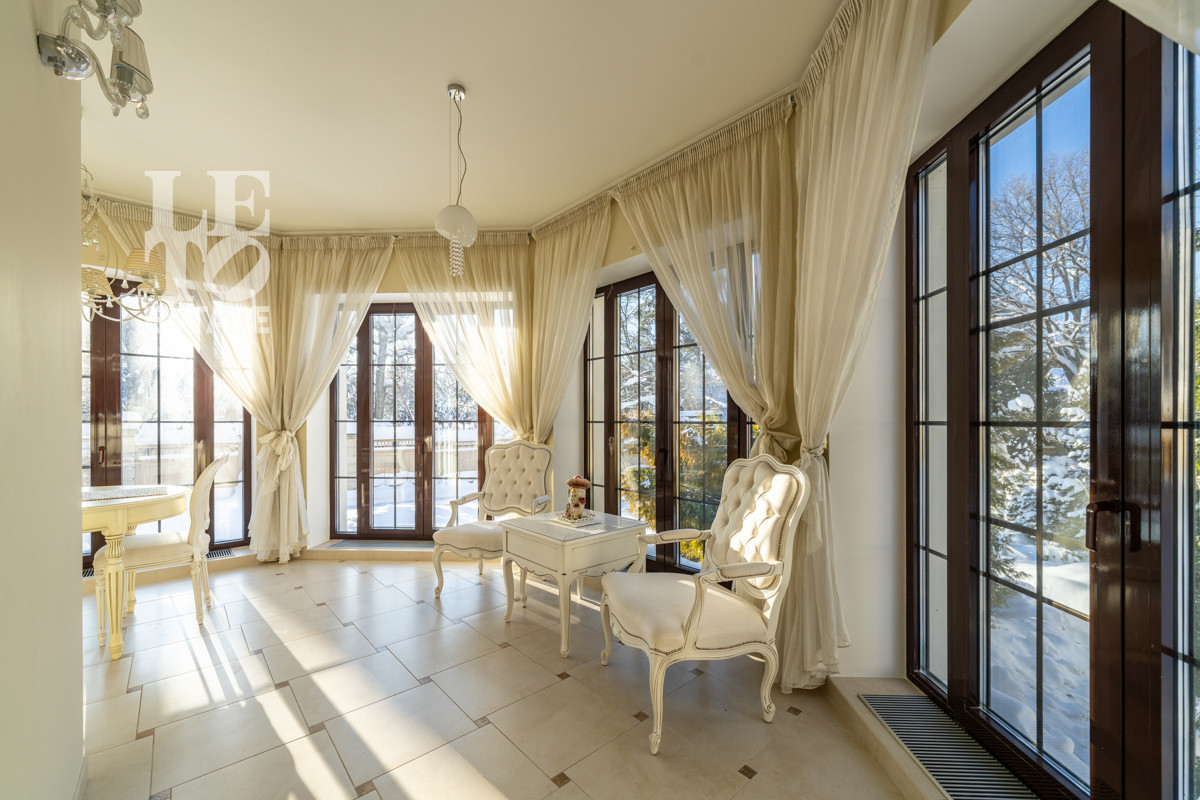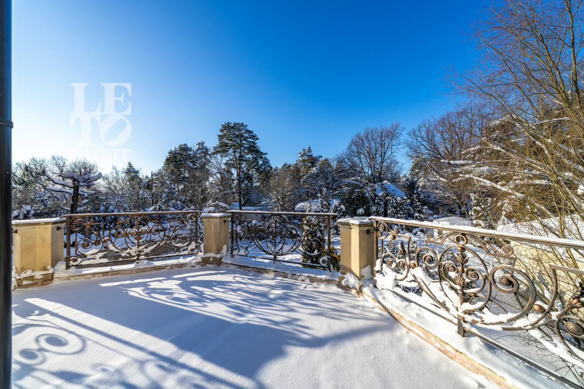 Архитектура — современная европейская классика: панорамные окна, стирающие границу между просторным интерьером и природой, натуральные материалы и уютные террасы с видом на большой участок и реку.