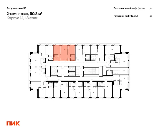 Продаётся 2-комн.квартира площадью 50.80 кв.м на 18 этаже 32 этажного дома (Корпус 1.1, секция 4) проекта ПИК Алтуфьевское 53. Светлый просторный подъезд на уровне земли, функциональная планировка, большие окна, с отделкой.
