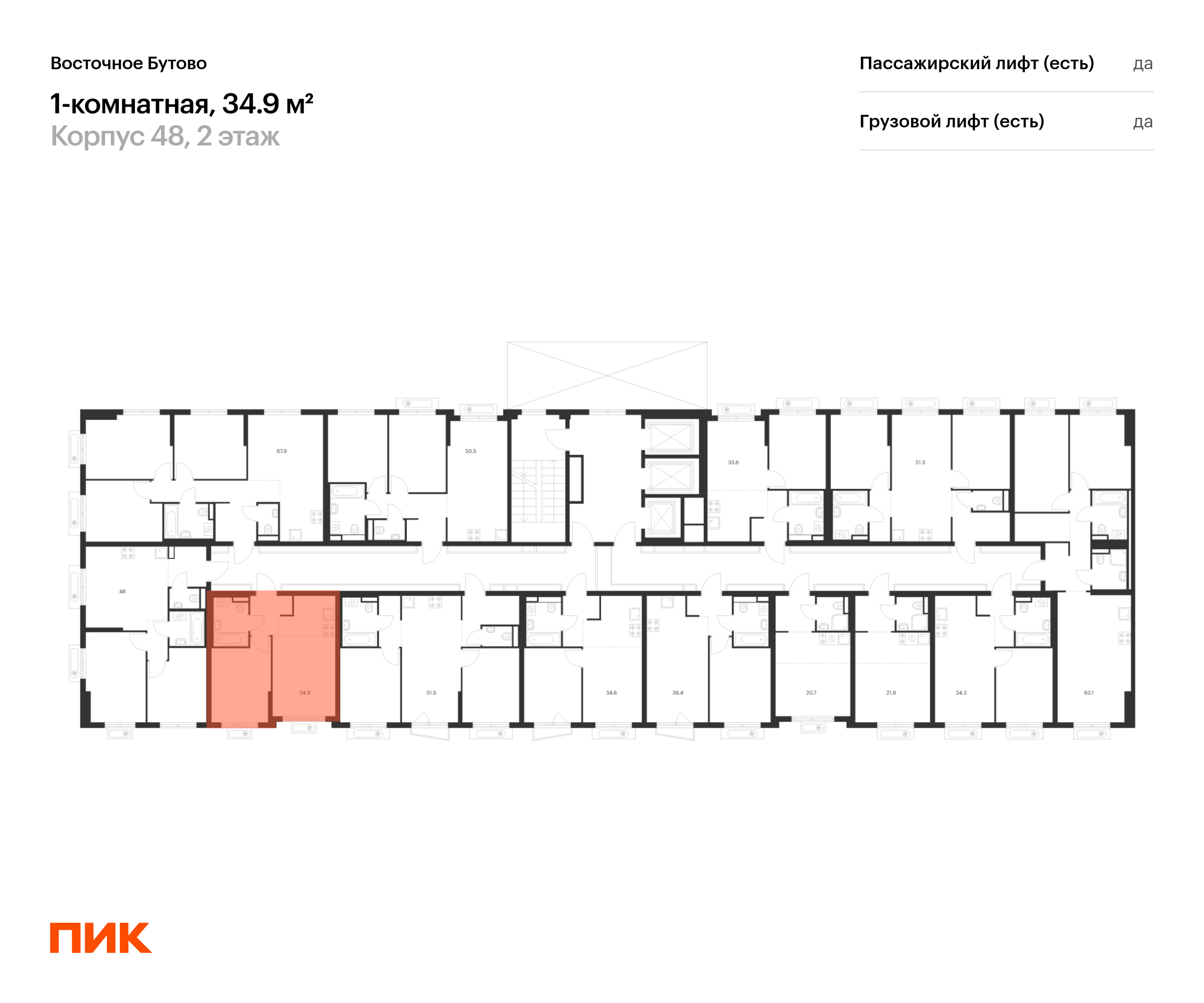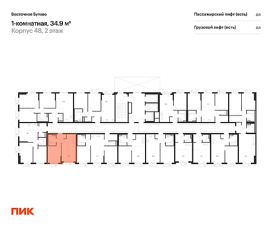 Продаётся 1-комн.квартира площадью 34.90 кв.м на 2 этаже 25 этажного дома (Корпус 48, секция 4) проекта ПИК Восточное Бутово. Светлый просторный подъезд на уровне земли, функциональная планировка, большие окна, с отделкой.