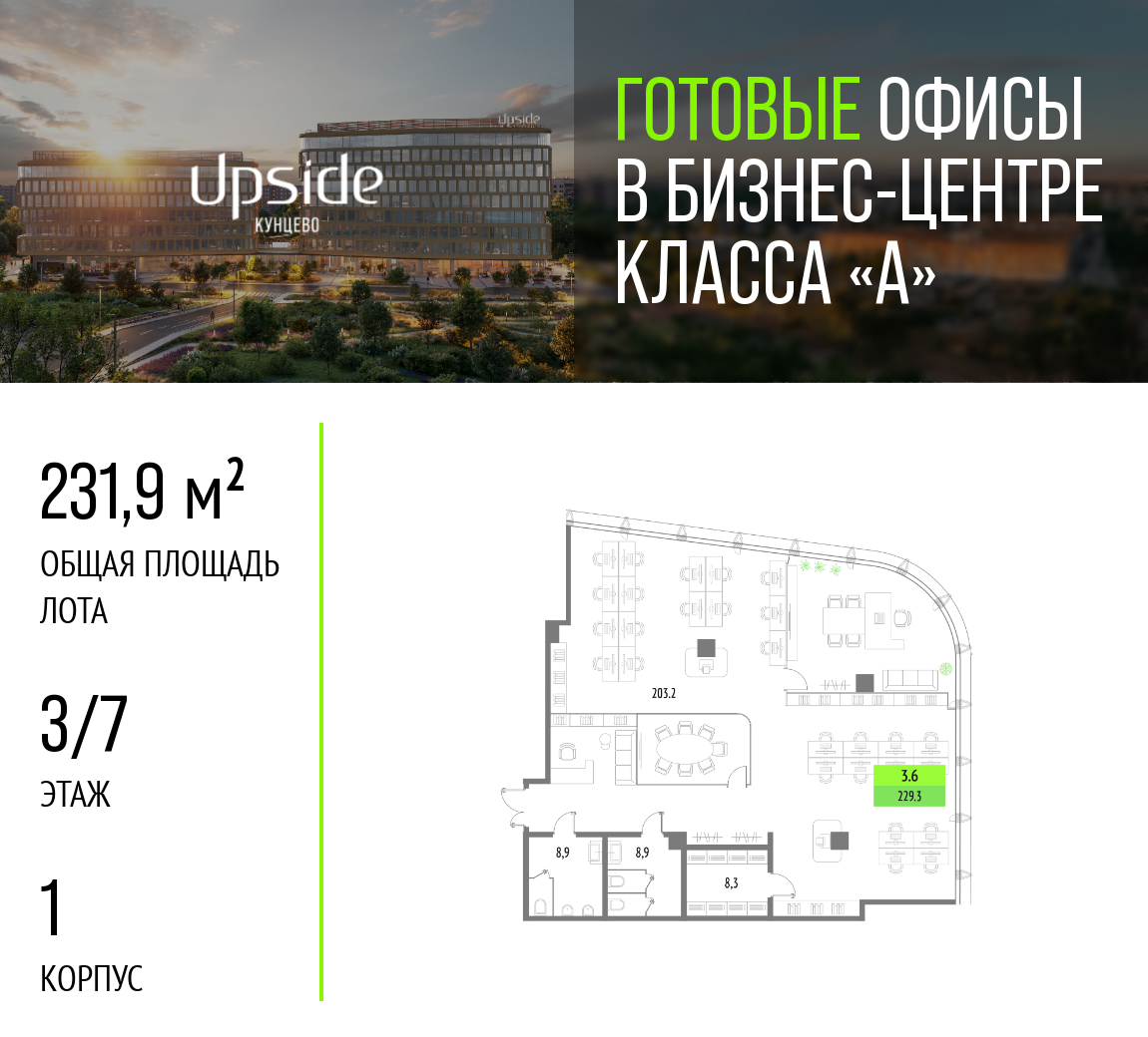 В продаже офисное помещение в бизнес-центре класса «А» Upside Кунцево. Ввод получен.