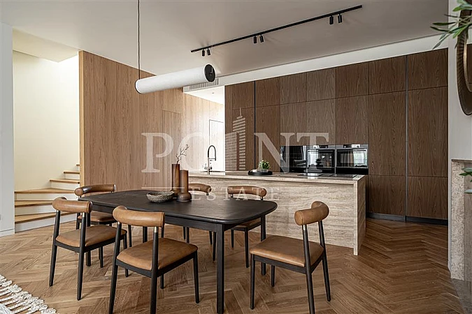 Лот: 114622. Продается таунхаус в коттеджном поселке "Парк Фонте". Каждая деталь этого дома создана для комфорта — от высоких 3,5-метровых потолков и панорамных окон до экологичной отделки натуральным дубом и травертином. В доме использованы лучшие материалы и технологии: инженерная доска Finex, двери скрытого монтажа Union, канальное кондиционирование, техника ASKO, Elica, Liebherr и смесители Grohe. Продуманная планировка на четырех уровнях включает: 1 этаж: прихожая с гардеробной, гостевой санузел, кухня-гостиная-столовая, котельная, терраса. 2 этаж: спальня с санузлом и гардеробной, кабинет с санузлом (может быть использован как спальня), лестничный хол, балкон. 3 этаж: cпальня с санузлом, 2 детские спальни, санузел, постирочная, лестничный холл. 4 этаж: помещение свободного назначения, эксплуатируемая кровля. Благоустроенный участок с системой автополива и газоном, а так же высажены туи. Здесь можно не только любоваться замечательным видом, но и обустроить летнее патио. Предусмотрены парковочные места для двух автомобилей.