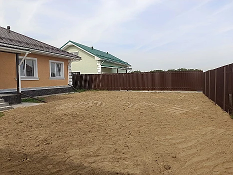 Участок благоустроен: газон, забор по периметру с калиткой и откатными воротами, подготовленное парковочное место для автомобиля.
