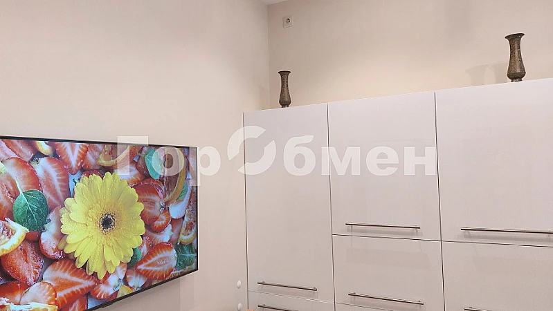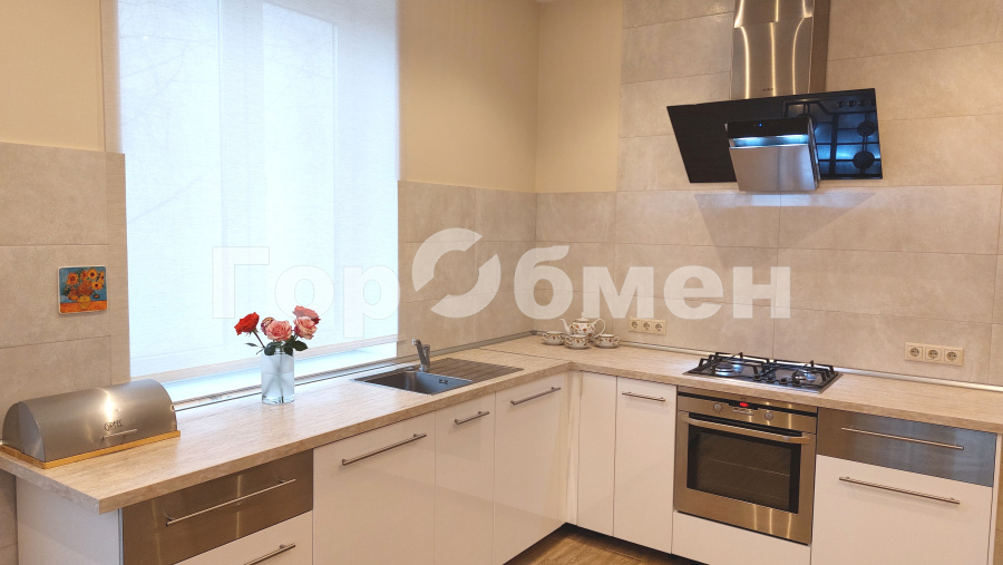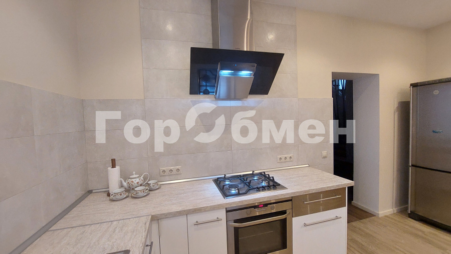 Коттедж оборудован современной мебелью. Кухонный гарнитур укомплектован встроенной техникой.