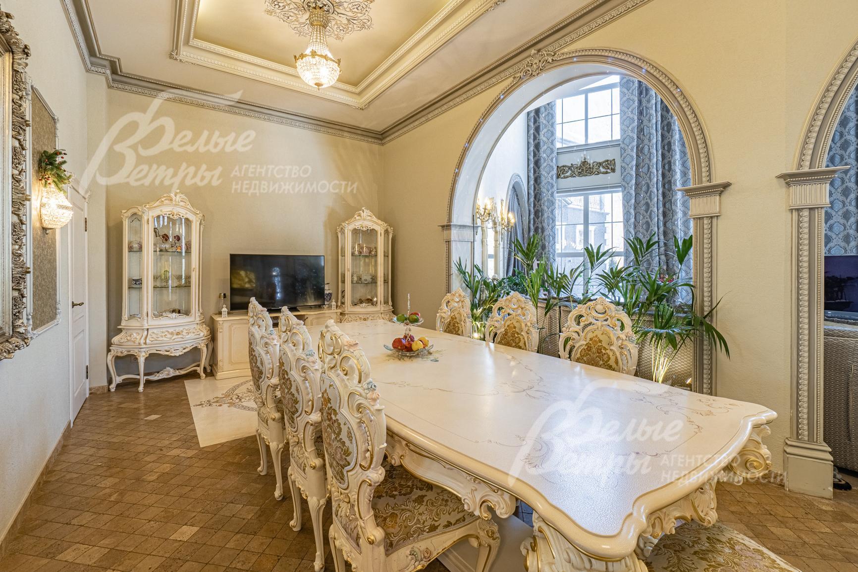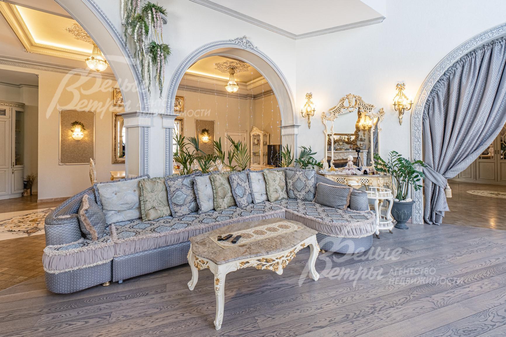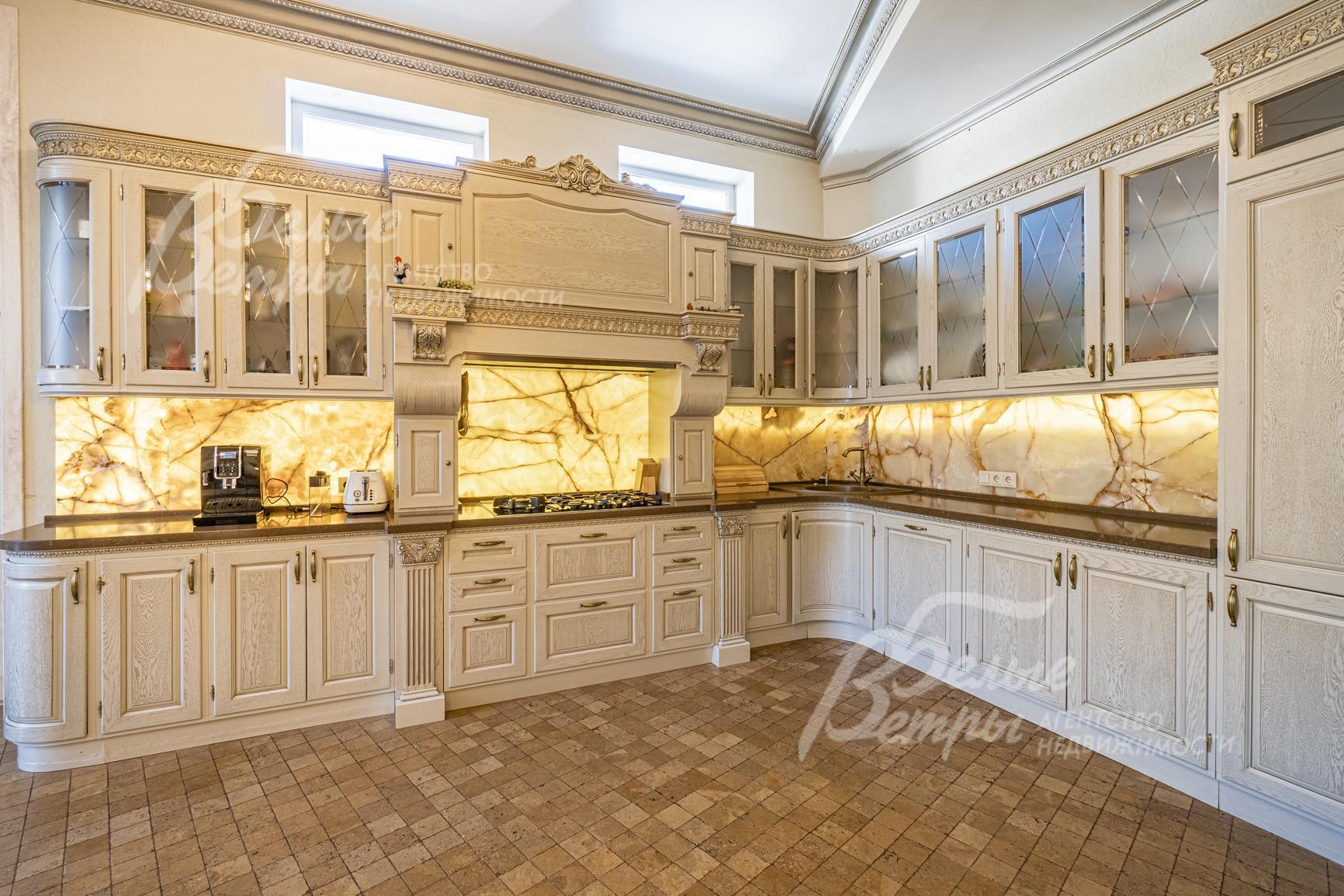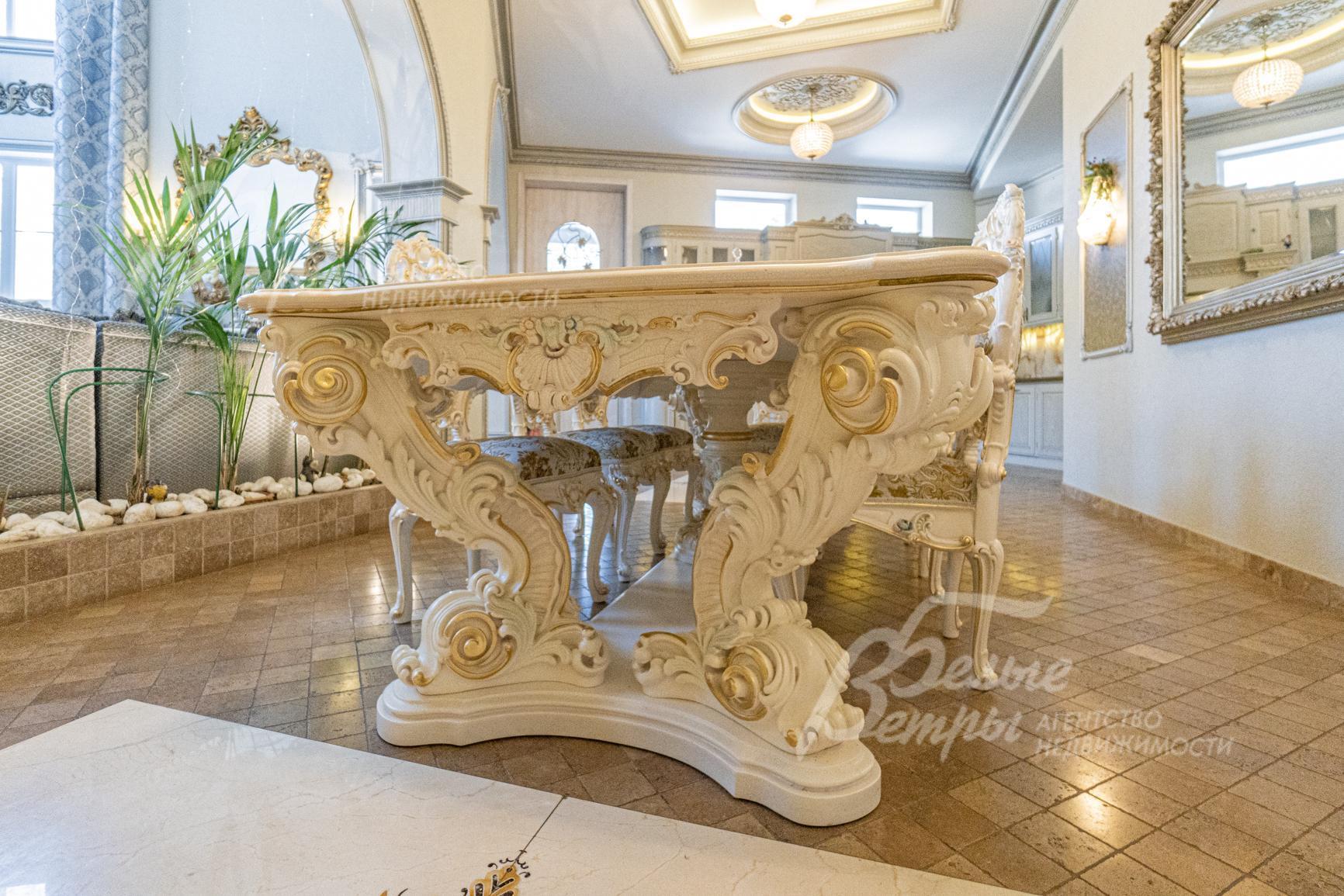 Мебель, оборудование: в мастер-спальне и детских комнатах антикварная мебель от итальянского производителя элитного сегмента SILIK. Также есть мебель от американского бренда CHESTER из кожи бизона. Полностью оборудованные гардеробные. Антикварные бронзовые светильники из Ирана и Европы. Фарфоровые люстры в детской. Антикварные столики и зеркала. В доме 4 кухни: Главная кухня выполнена в классическом стиле по эскизам Скаволини с дубовыми фасадами и фартуком из оникса с подсветкой (этим же ониксом отделан алтарь храма в МГИМО), оснащена встроенной техникой NEFF. Холодная кладовая при кухне продумана до мелочей. Имеет винный шкаф. Столовая группа в стиле барокко на 10 персон (SILIK). Шторы, текстиль (итальянский) и мебель в гостиной выполнены в едином стиле. В лестничном холле действующий фонтан из розового корейского мрамора..
