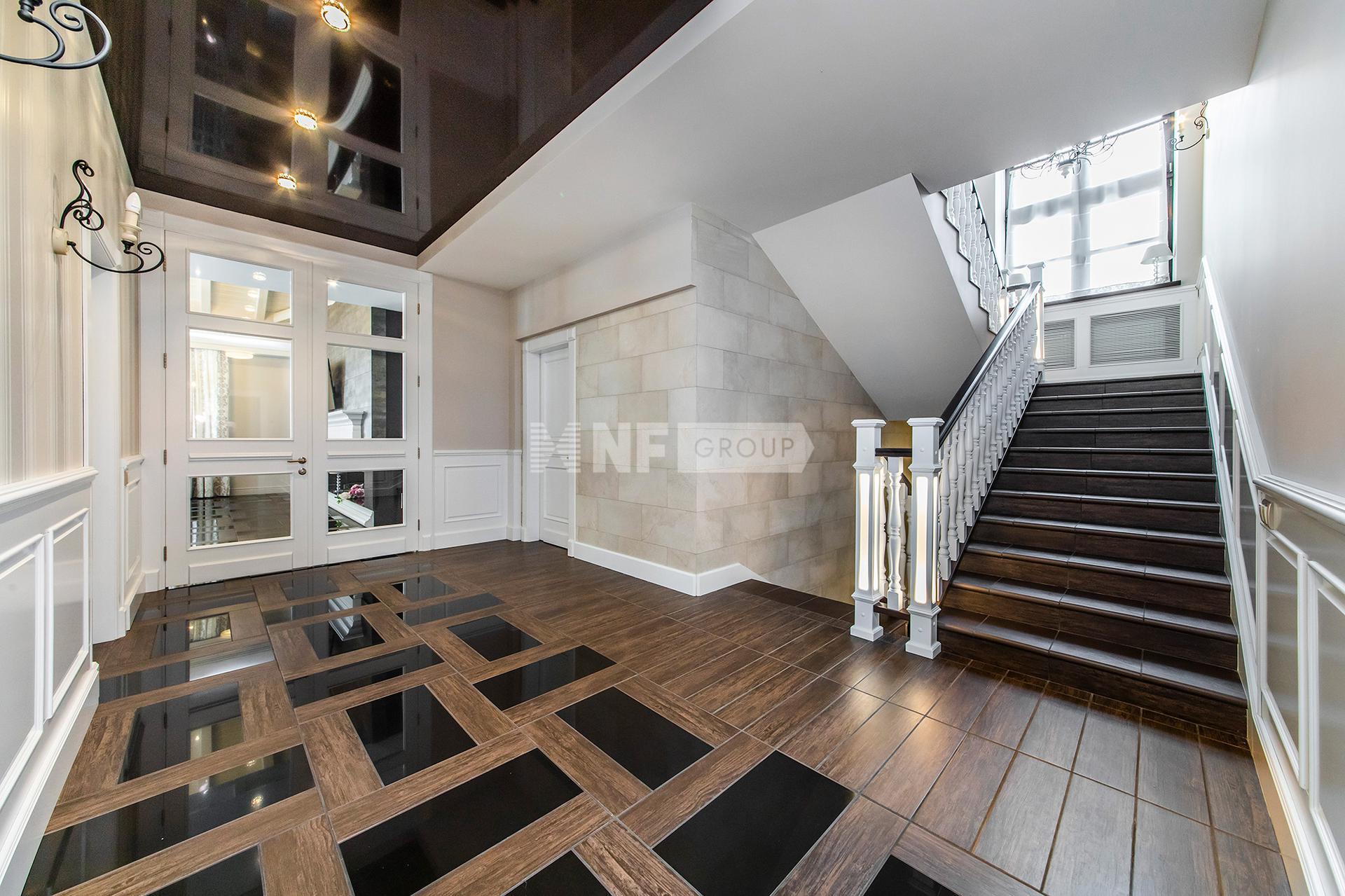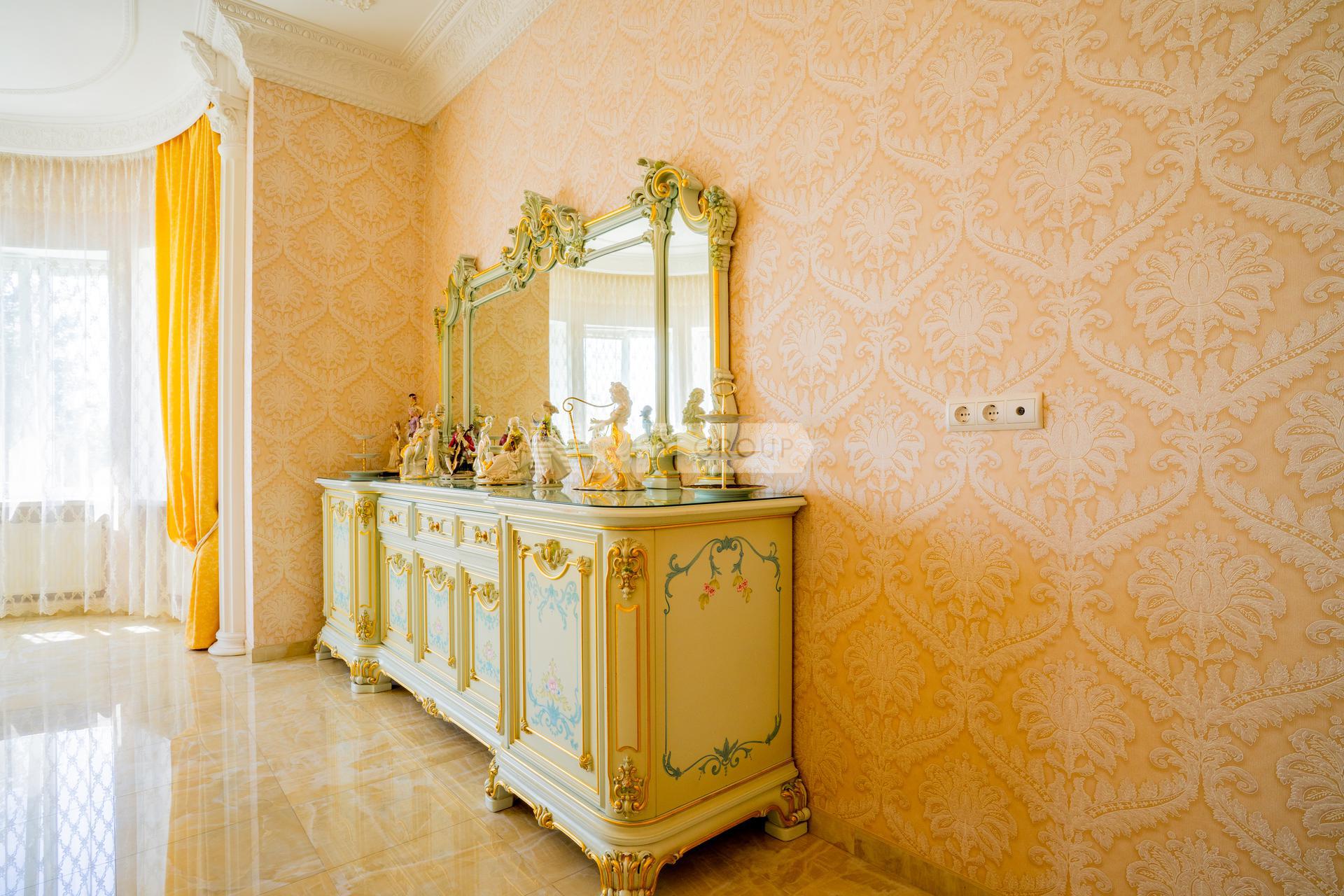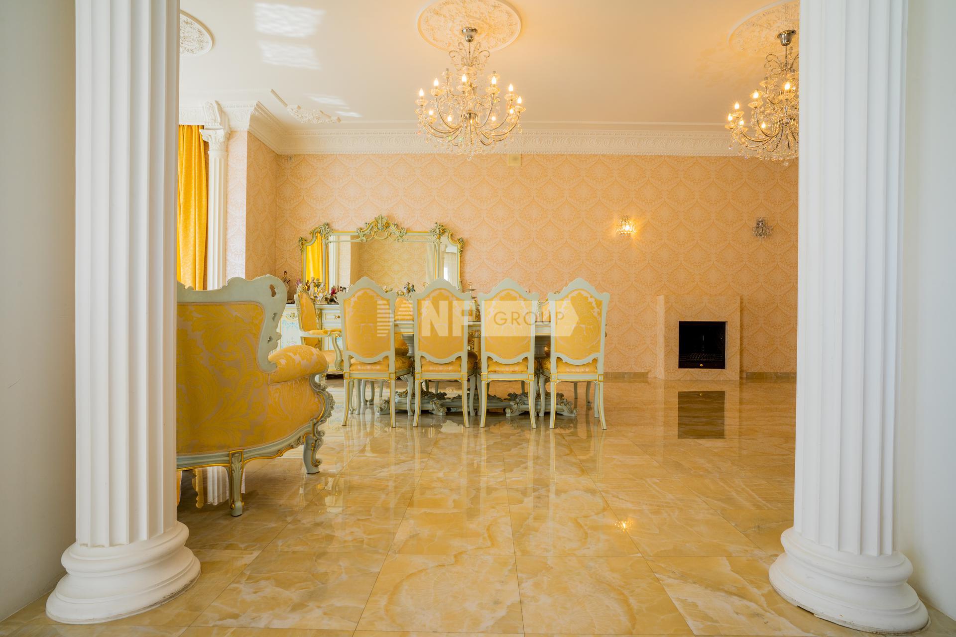 Внутренняя отделка: выполнена дизайнерская отделка с применением дорогих натуральных материалов: мрамор, травертин, оникс, массив дуба, инженерная доска. Дизайн в стиле неоготика (вдохновлен европейскими замками). На стены нанесена декоративная штукатурка, поклеены дорогие обои, декор - лепнина из гипса, расписывалась художником в течение полугода. Санузел мастер-спальни отделан ониксом с подсветкой. Спа-зона - дорогая арабская 3D плитка. В детских комнатах порталы из гималайской соли с подсветкой, фрески. Витраж на потолке в гостиной выполнен на заказ по индивидуальному проекту в технике Тиффани (стекло-олово запекание). Купол диаметром 4 м. В лестничном холле еще 3 антикварных витража. Портал камина из белого мрамора - копия камина одного из замков в Европе. Столярка массив бука. Бассейн с противотоком. На стенах витражи, на потолке имитация звездного неба. Парная: канадский кедр, абаш, панно из гималайской соли. На полу наборные мраморные панно из нескольких видов мрамора, а также малахита, азула, оникса и еще более 10 разновидностей камня. Выполнены на заказ по индивидуальному проекту. Также пол отделан мрамором, травертином, инженерной доской, ониксом (в санузле). Бетонная лестница шириной 2,1-1,5 м, ступени отделаны 2-мя видами мрамора: Crema Marfil и Emperador Light, художественная ковка ограждения. Подвесные потолки сложной формы с подсветкой. Кессоны, витражи, фрески, несколько видов подсветки, сложные ажурные лепные формы. Установлена импортная сантехника премиальных брендов Old England, Cezares в классическом стиле. Теплые полы водяные везде под плиткой и в санузлах. Электрика Legrand. Конвекторы внутрипольные, стальные панельные. Межкомнатные двери из массива бука, выполнены по индивидуальным проектам. Подоконники выполнены из мрамора Crema Marfil..