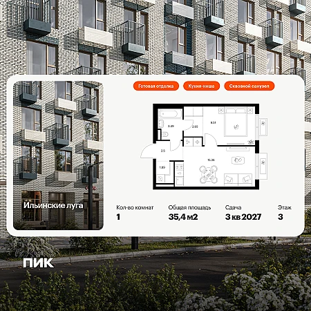 Продаётся 1-комн.квартира площадью 35.40 кв.м на 3 этаже 9 этажного дома (Корпус 4.1, секция 5) проекта ПИК Ильинские луга. Светлый просторный подъезд на уровне земли, функциональная планировка, большие окна, с отделкой.