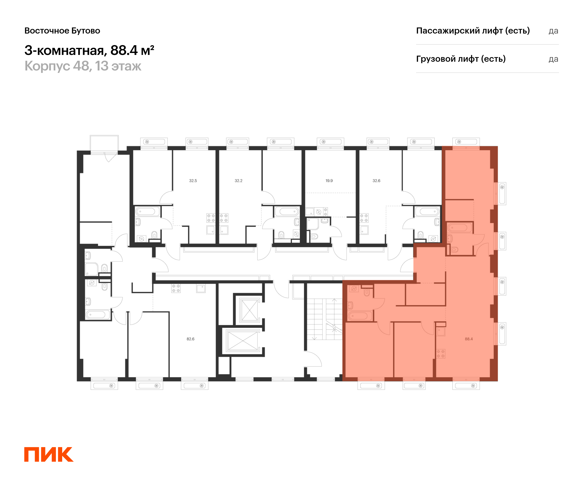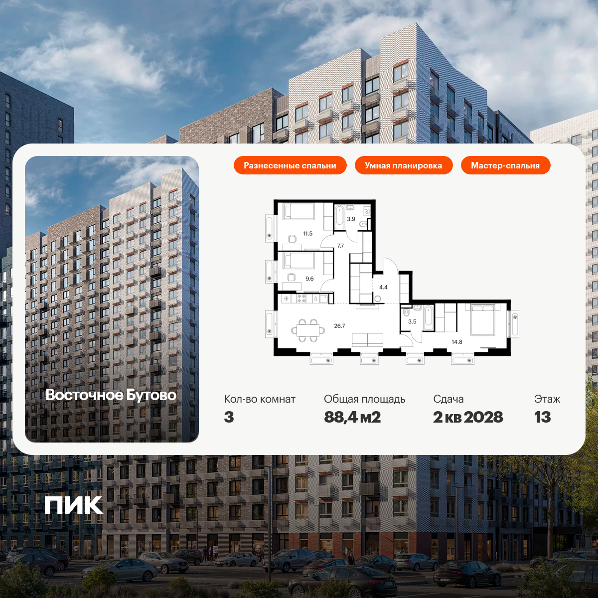 Продаётся 3-комн.квартира площадью 88.40 кв.м на 13 этаже 17 этажного дома (Корпус 48, секция 1) проекта ПИК Восточное Бутово. Светлый просторный подъезд на уровне земли, функциональная планировка, большие окна, с отделкой.