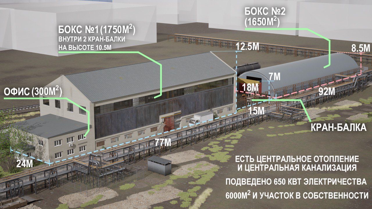 1. Производственно-складской бокс - 1700 м2, размер 24х72. Высота потолков 12 м, до крюка 7,5м. Цех оборудован двумя мостовыми кранами по 5 т.