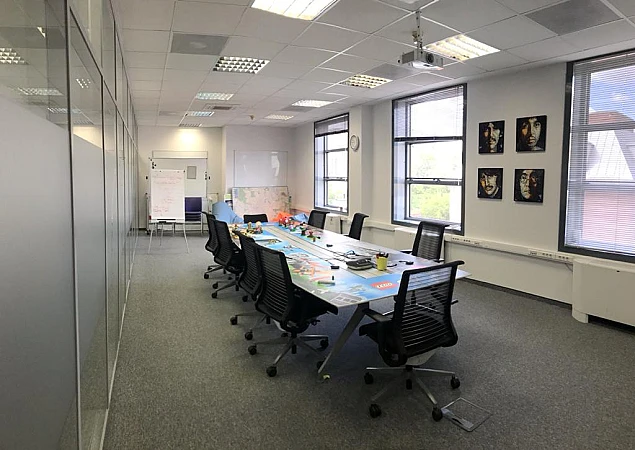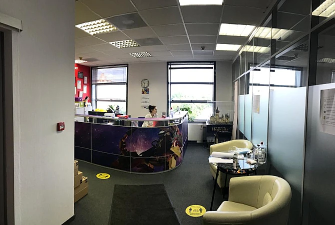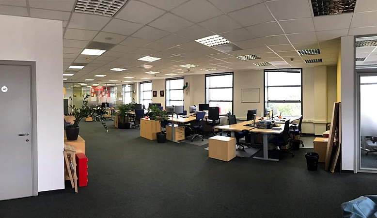В блоке есть зона ресепшн, большой рабочий зал для сотрудников, отдельные кабинеты и переговорные комнаты, санузлы и кухня.