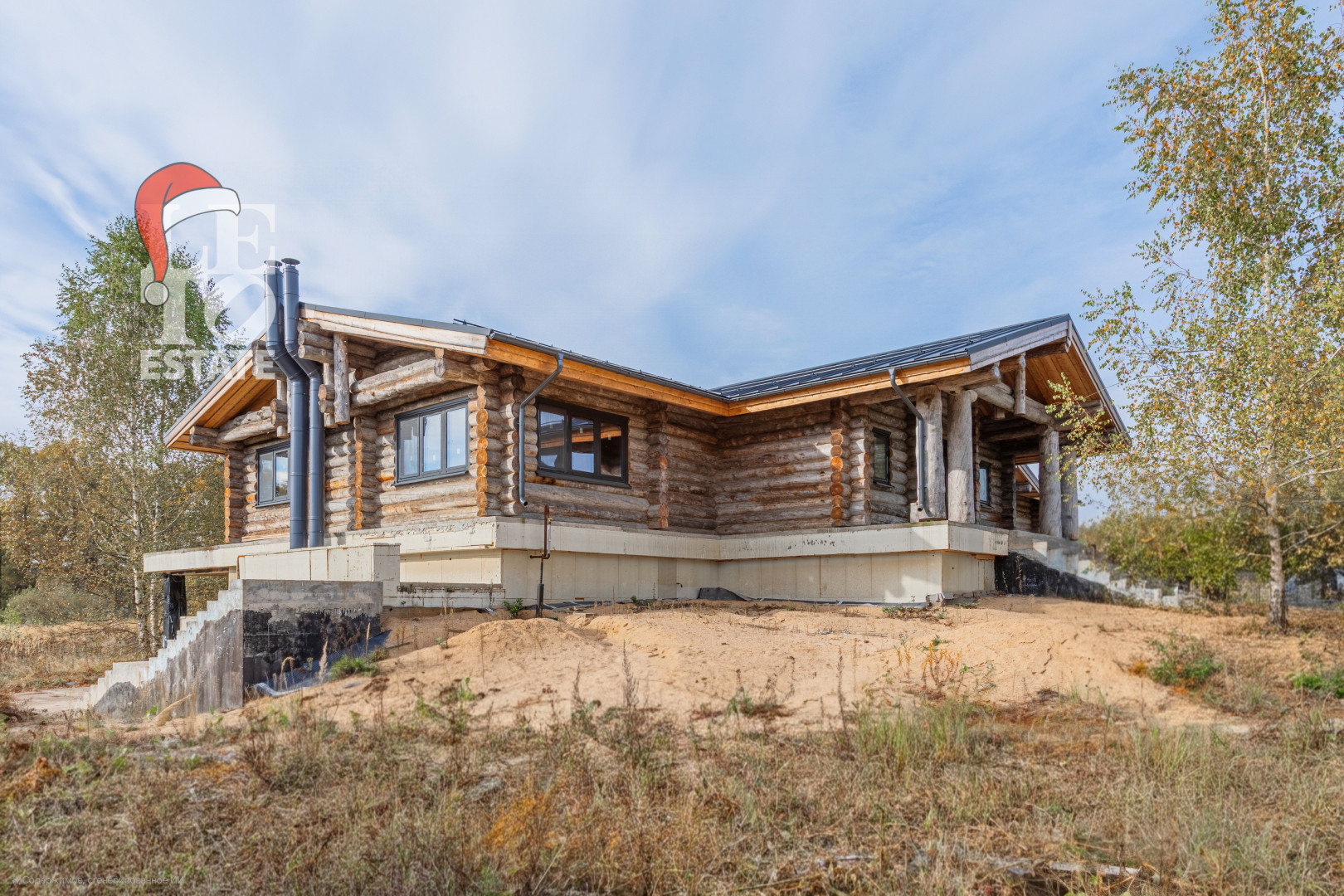 Основная часть дома (первый этаж) возвышается над основательным монолитным цокольном этажом высотой 4 метра. Первый этаж выполнен из сухостойной сосны, привезенной из Карелии компанией ARTKELO. Натуральный цвет дерева подчеркивает текстуру и безупречность материала.