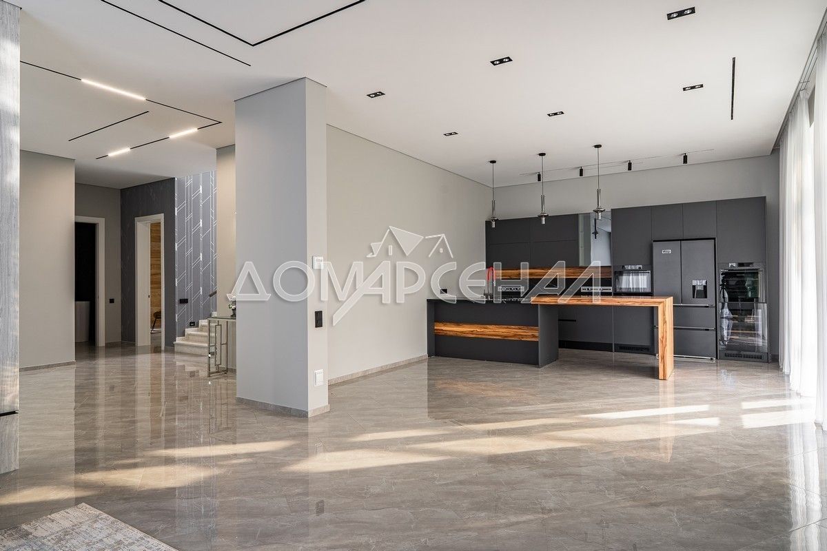 1 этаж: просторный светлый холл с гардеробной, кладовой и выходом в отапливаемый гараж на 2 автомобиля. Единое пространство кухни-столовой и гостиной. Кухня оборудована мебелью студии Giulia Novars, укомплектована техникой Asko и Bora. Из этой зоны есть выход на уютную летнюю террасу. В зоне гостиной - дровяной камин, отделанный мрамором. На первом этаже также расположена СПА-зона с сауной и просторной зоной отдыха, с/у, котельная