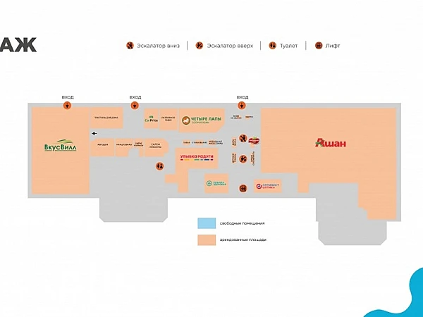 . 1 этаж – супермаркет Ашан, салон связи, аптека, ресторан-пиццерия, зоомагазин «4 ЛАПЫ», салон красоты.
