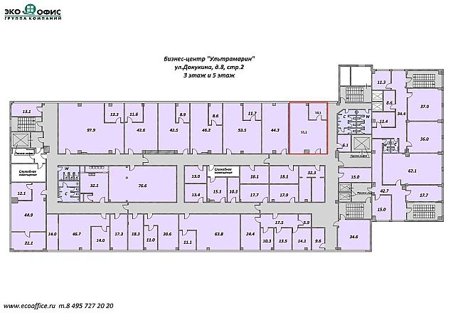 3 этаж, 8-этажное здание. Помещение с окнами: зал 55.1 м и кабинет 10.1 м.