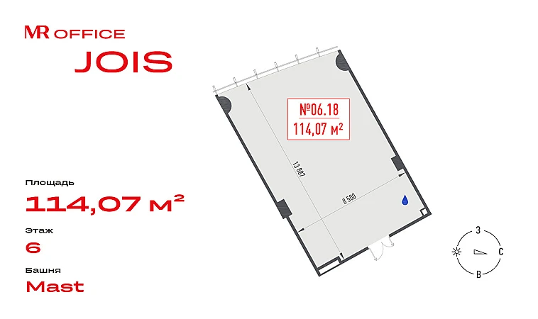 Предлагается офисное помещение 114.07 кв.м на 6 этаже БЦ Jois.